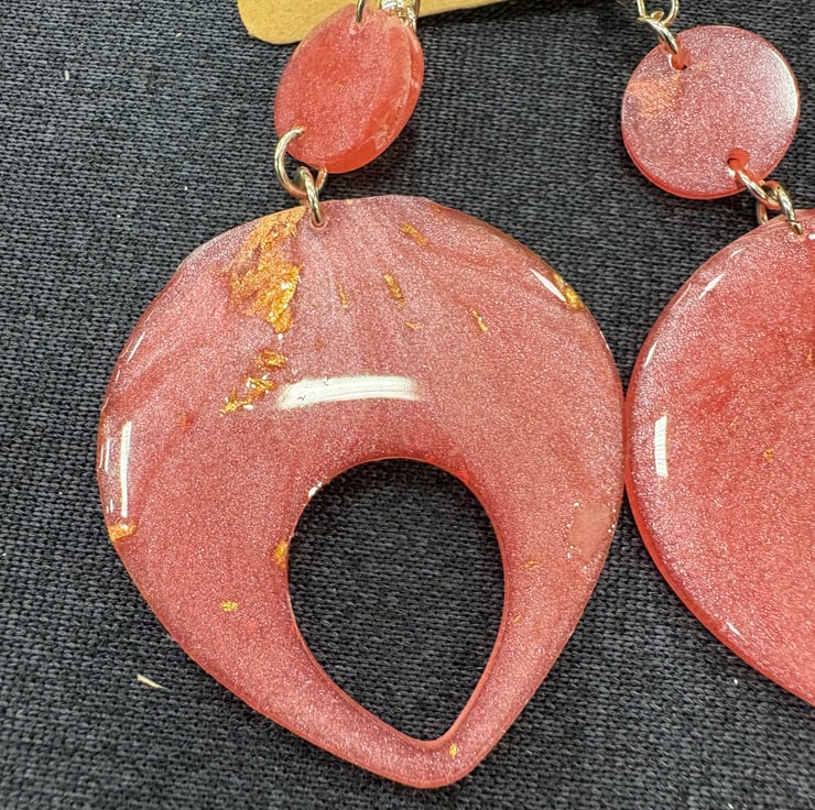 Gorgeous lightweight resin earrings in a teardrop shape. Hand poured resin in a light pink colour with flecks of gold leaf for that special touch. Approx 3 inch in length.