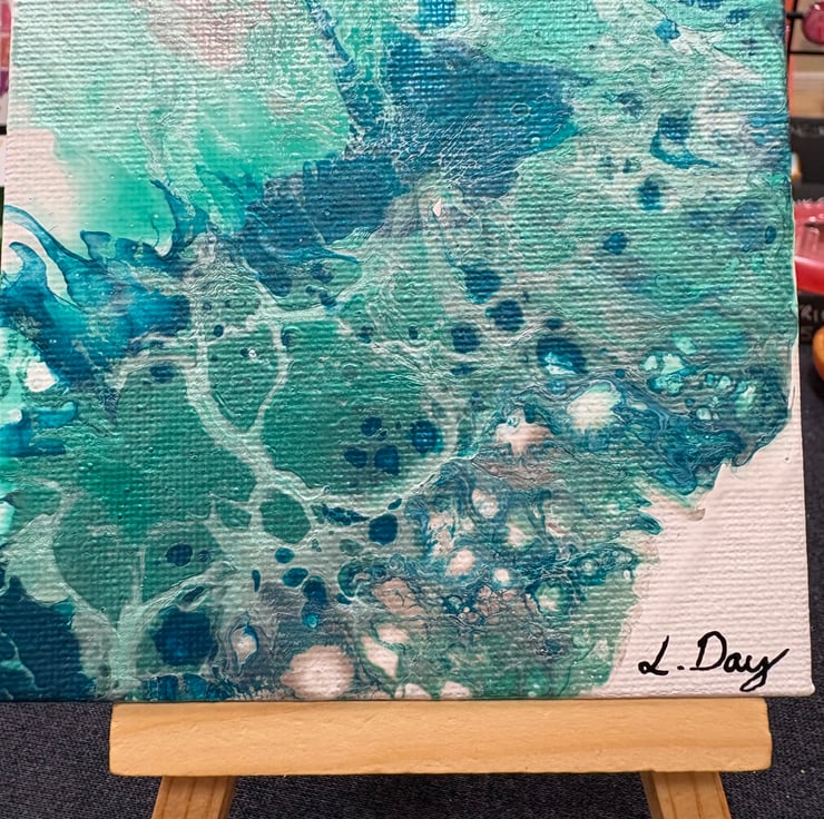 Small easel-mounted acrylic art work. The abstract colours are inspired by the sea and will brighten up any windowsill or shelf!
