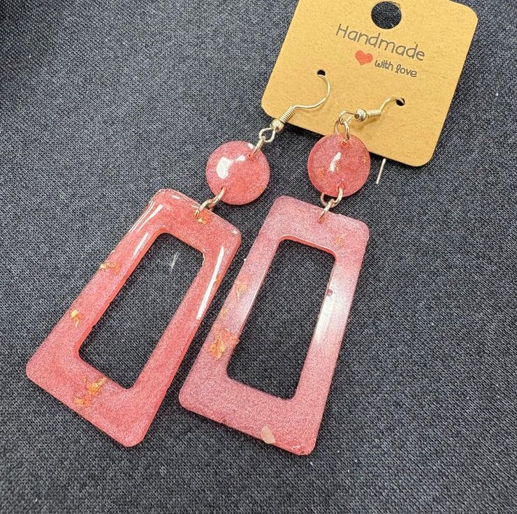 Gorgeous lightweight resin earrings in an abstract rectangle shape. Hand poured resin in a light pink colour with flecks of gold leaf for that special touch. Approx 3 inch in length.