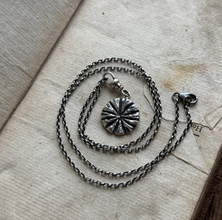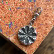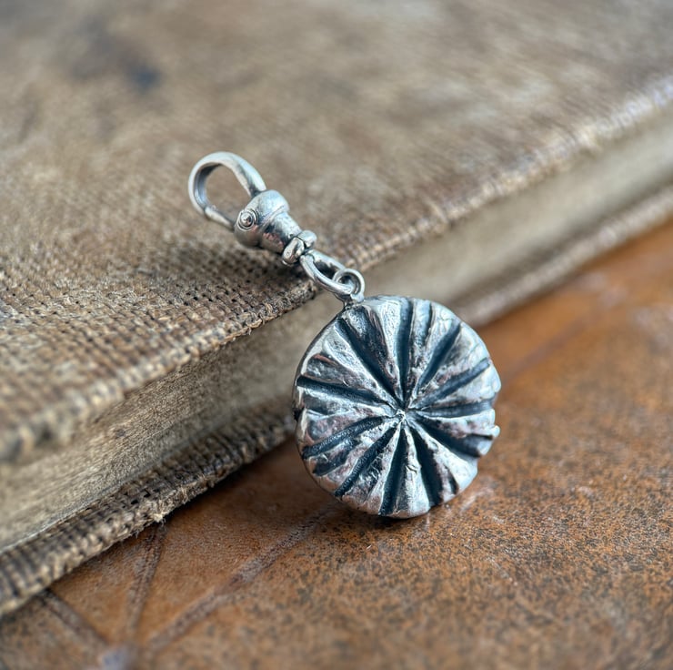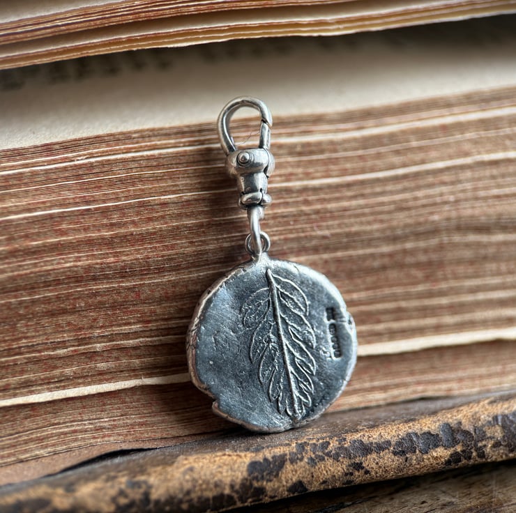 A one of a kind double sided recycled Sterling silver Poppy head and leaf clip-on pendant. Made from the impressions of a poppy head and a tiny wildflower leaf both from our garden.