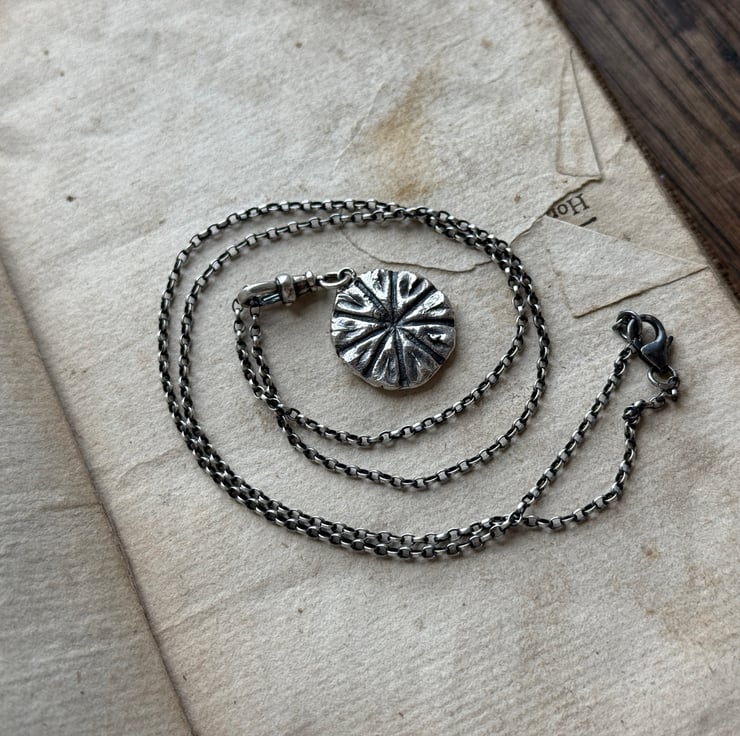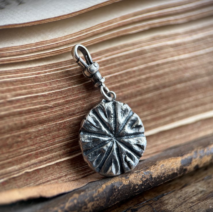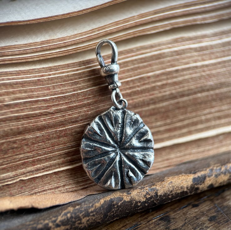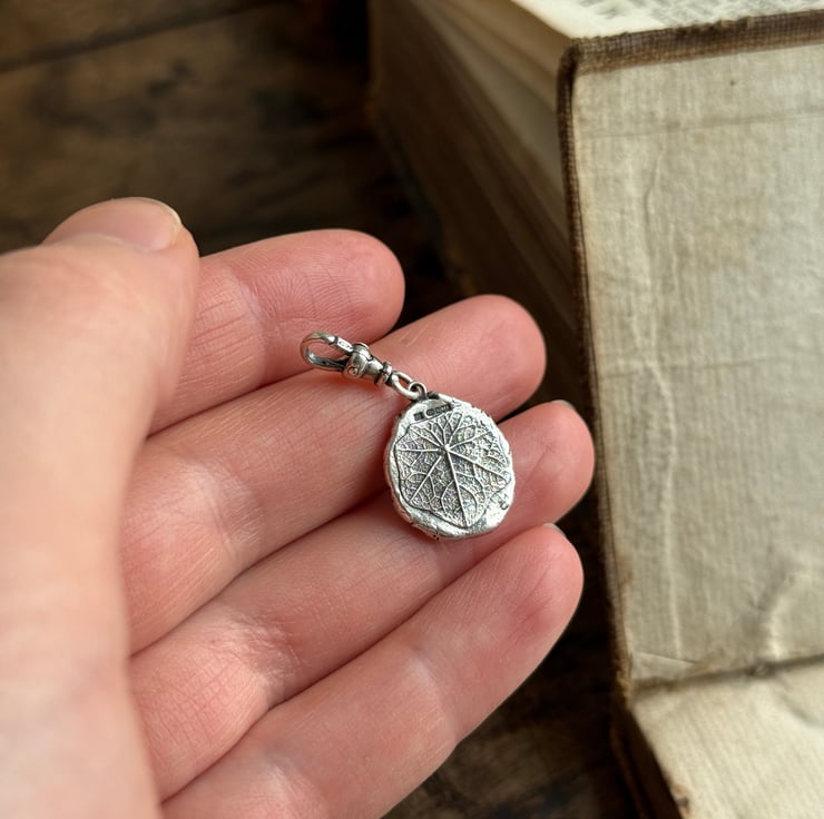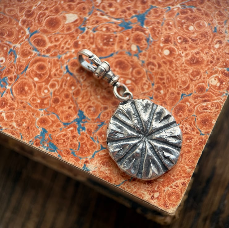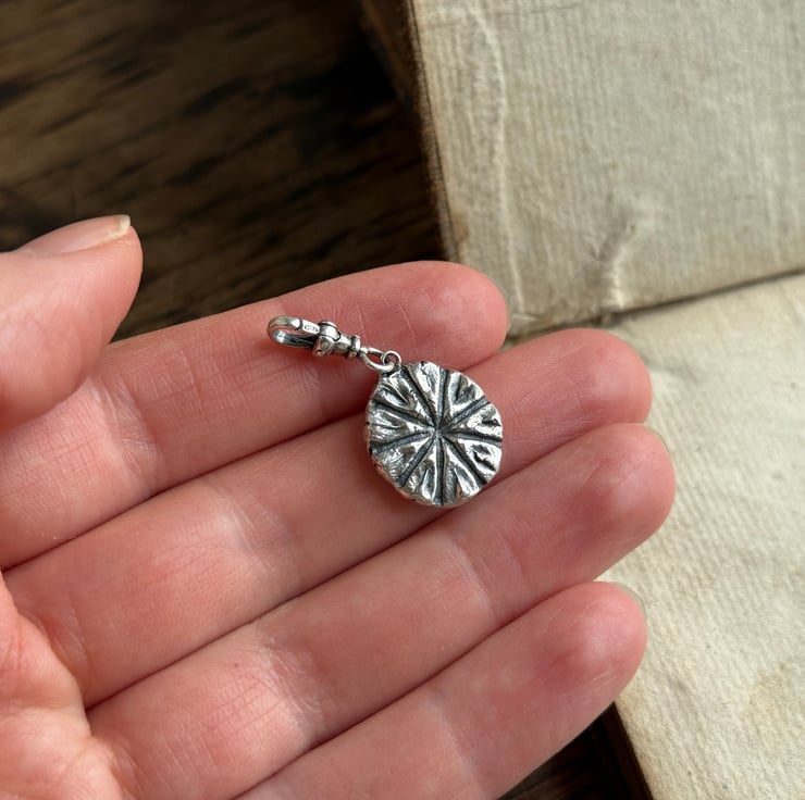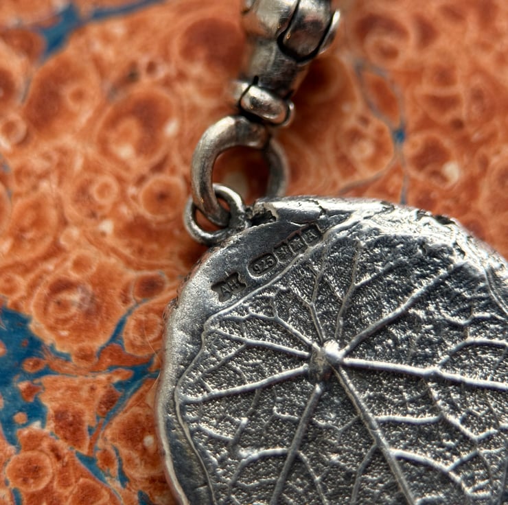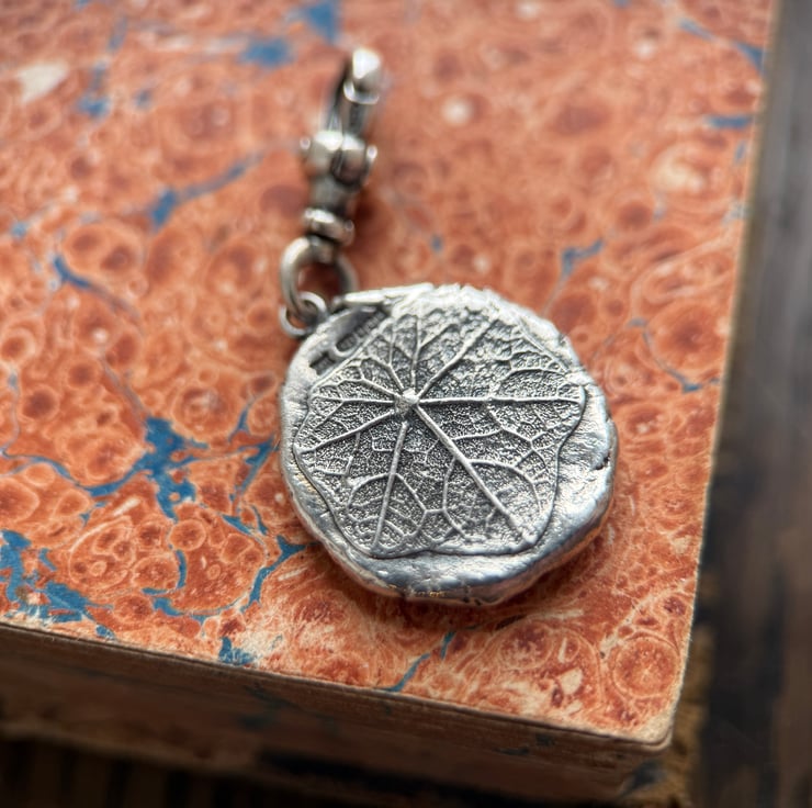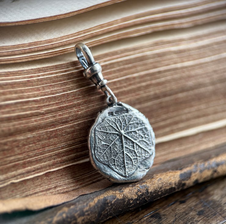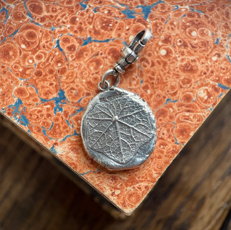 A one of a kind double sided recycled Sterling silver Poppy head and nasturtium leaf clip-on pendant. Made from the impressions of a poppy head and a tiny nasturtium leaf both from our garden.