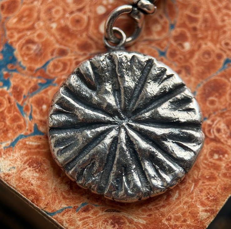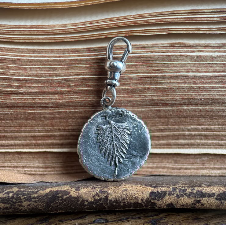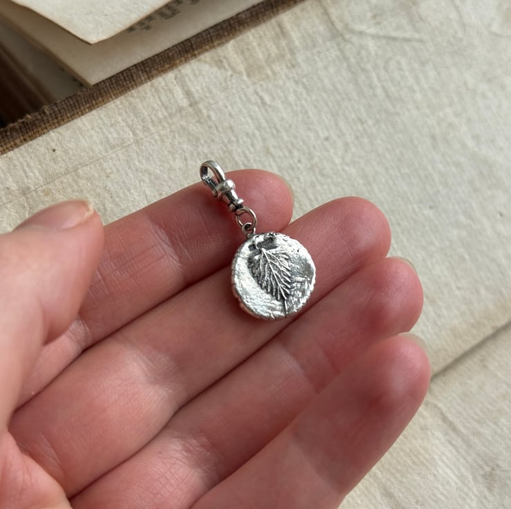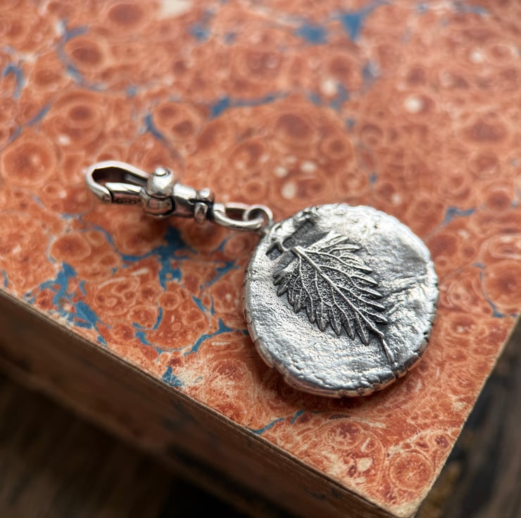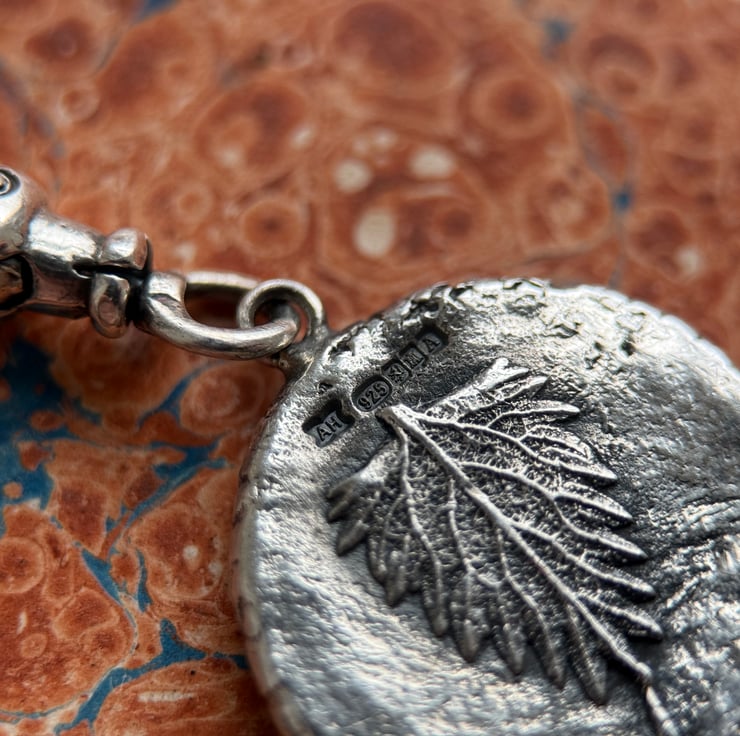 A one of a kind double sided recycled Sterling silver Poppy head and Stinging Nettle leaf clip-on pendant. Made from the impressions of a poppy head and a tiny stinging nettle leaf both from our garden.