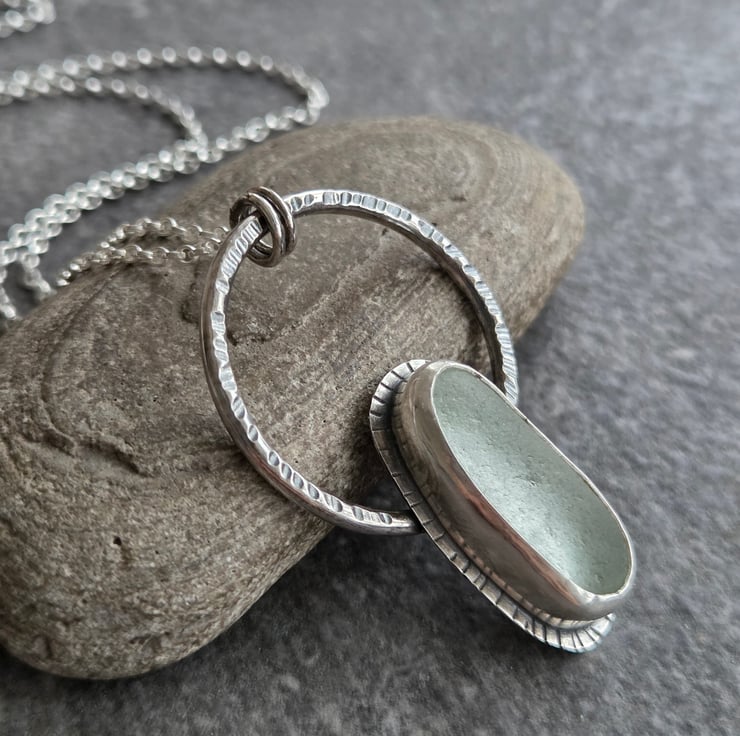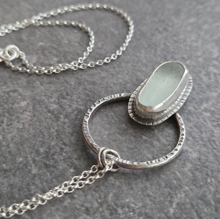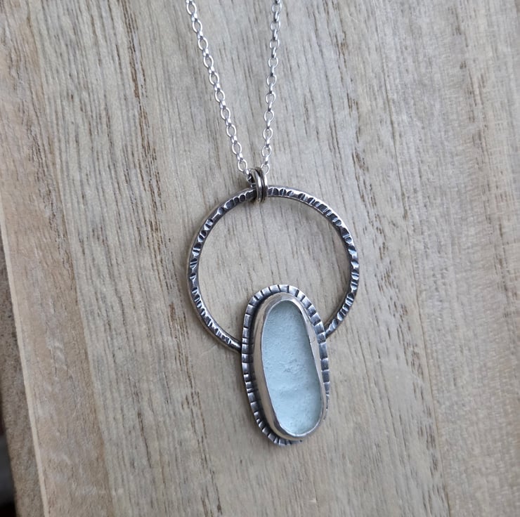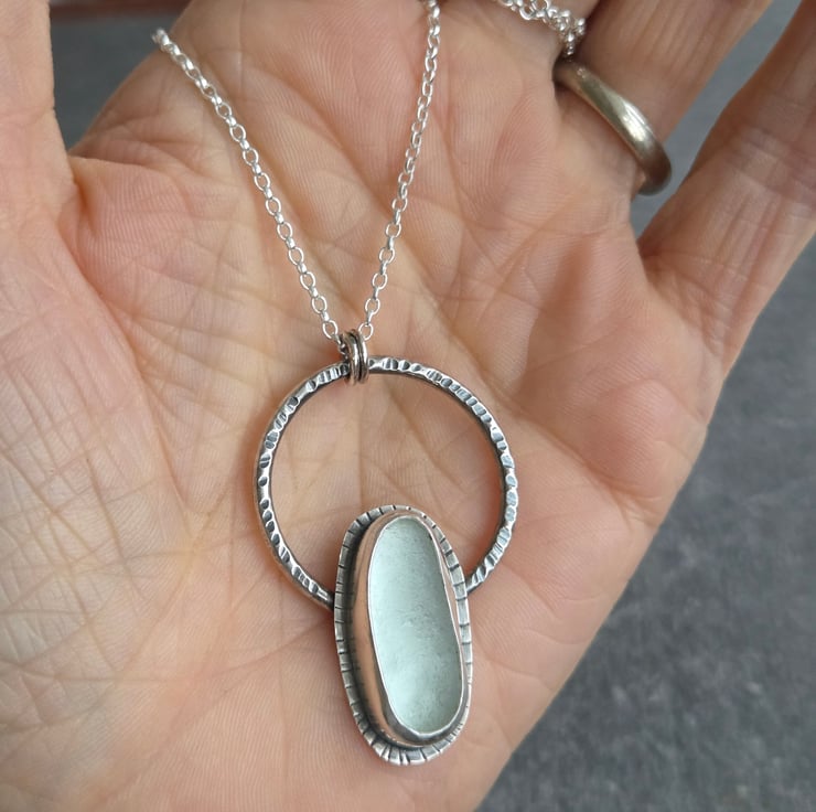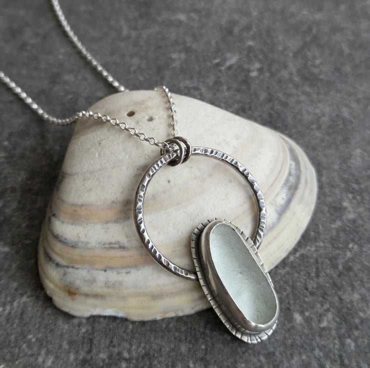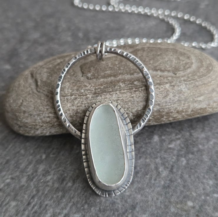 An elongated oval of frosted white seaglass is set in sterling silver and placed on a sturdy textured silver hoop. I've oxidised the silver to bring out the texture detail and give a good contrast between the metal and the pale glass, and hung the pendant from a sterling belcher chain.