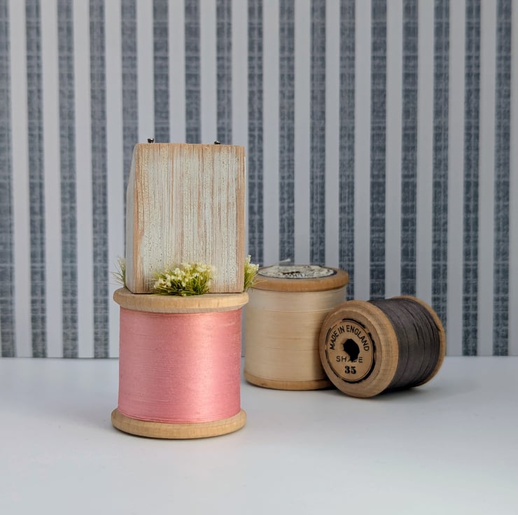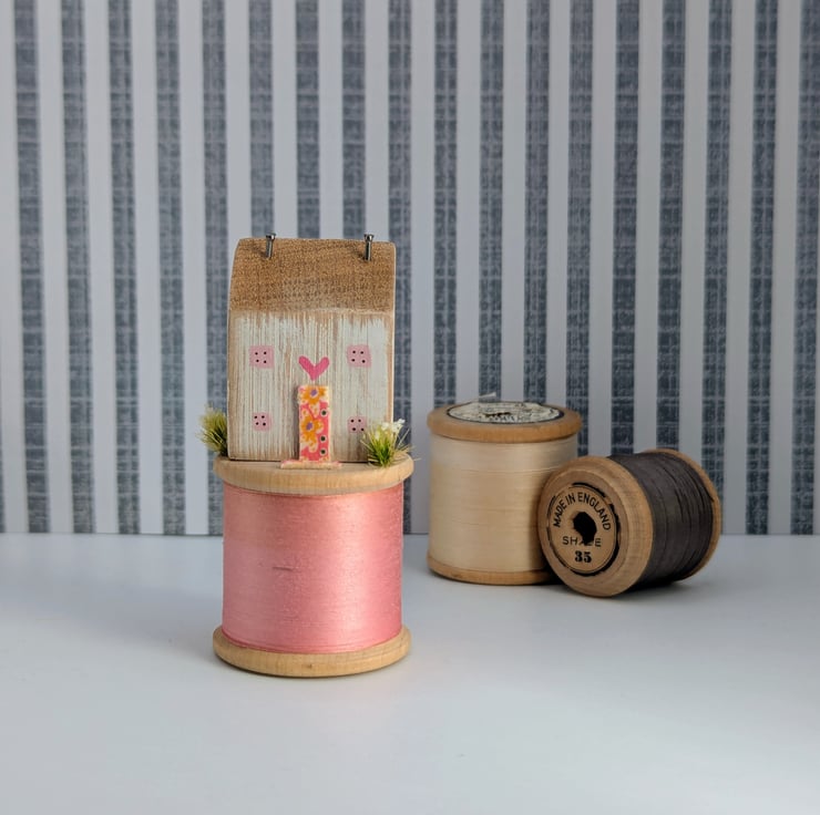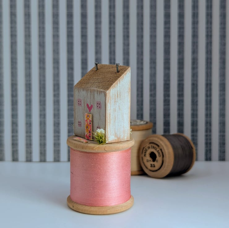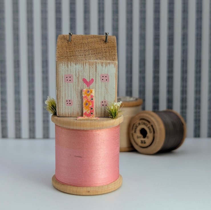 Thread Cottage is a tiny handmade wooden cottage decoration on top of a wooden vintage bobbin.