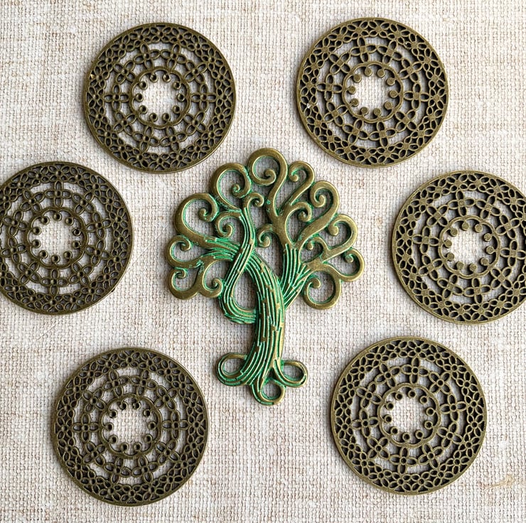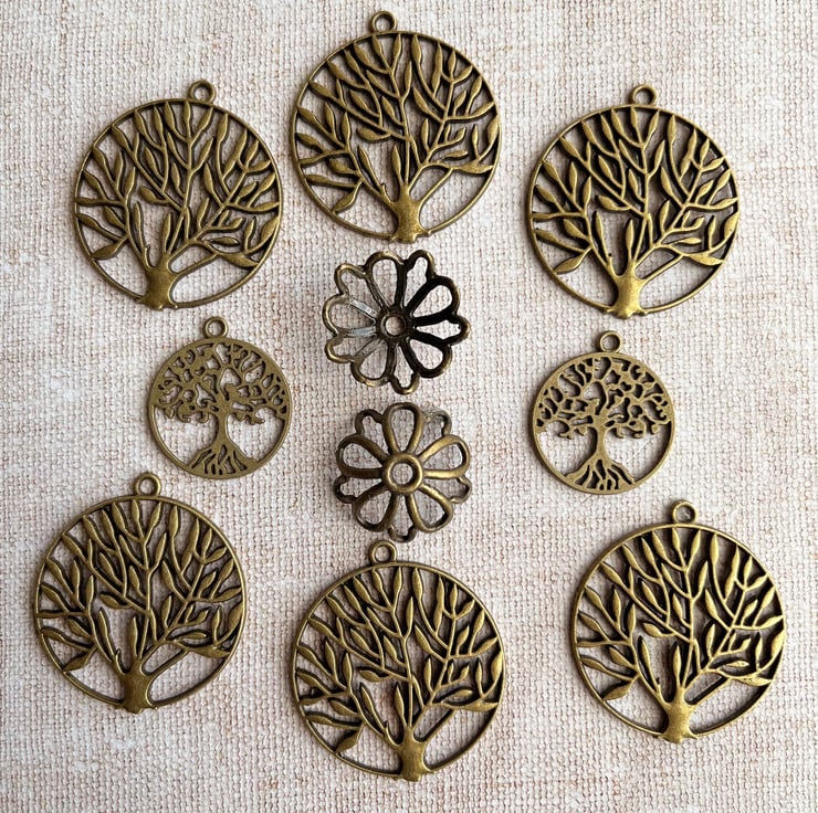 All the items are in Antique bronze tone except for the two large silver-tone filigree elephants. As a size guide, the verdigris Tree of Life in the centre is 7.5cm high.