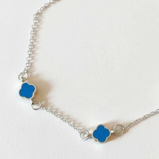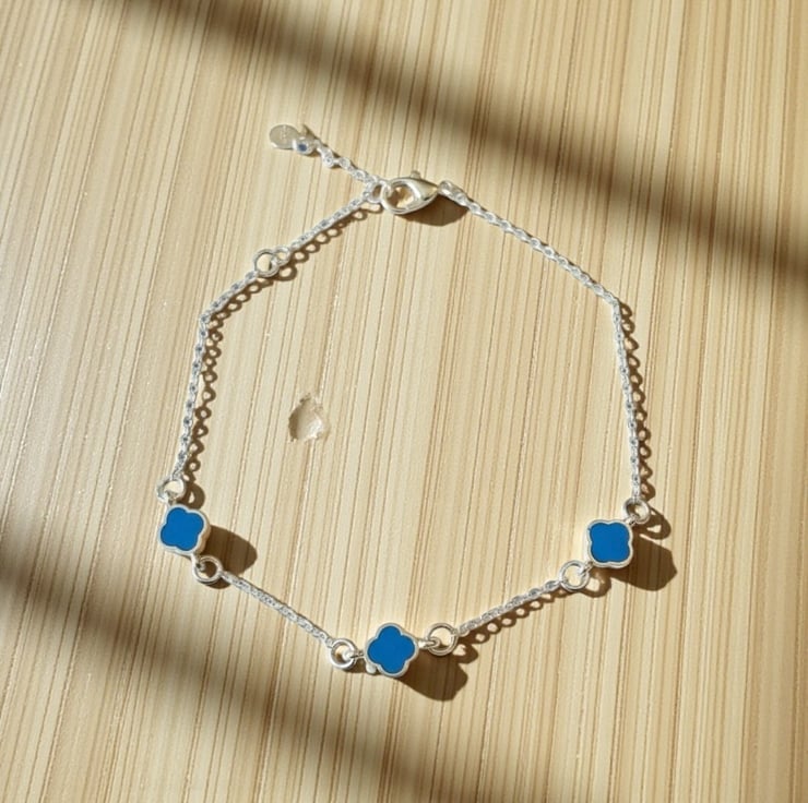 This delicate handmade bracelet features a fine 925 sterling silver chain accented with 3 pretty cobalt blue silver plated enamel clover charms.,creating a clean, modern contrast between the rich blue enamel and the bright silver finish.