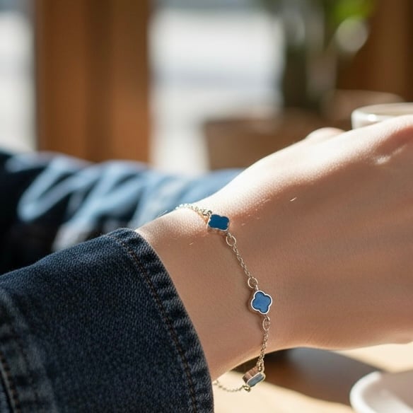 The bracelet is lightweight and comfortable, designed to sit gracefully on the wrist. A secure lobster clasp with an adjustable extender allows for a customizable fit, making it perfect for everyday wear or layering with other bracelets. The clover motifs add a subtle touch of charm and symbolism, often associated with luck and positivity.