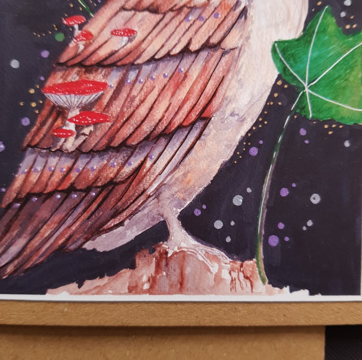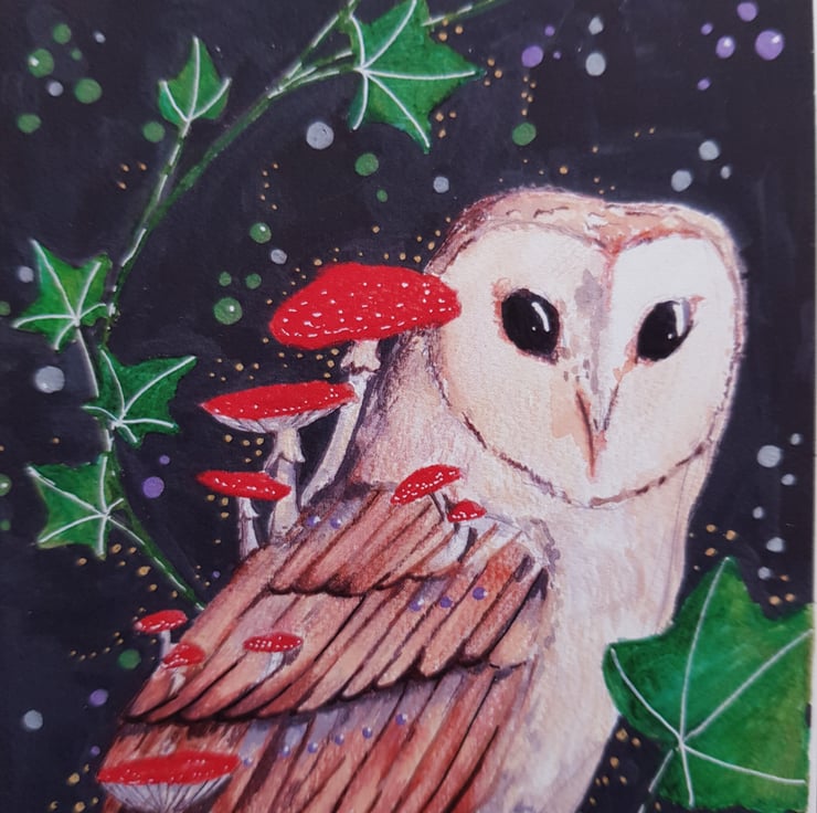 In some traditions, barn owls are seen as symbols of wisdom and love due to their heart-shaped faces. I depicted the owl with small fly agaric growing through her feathers as a symbol of secret knowledge while the ivy represents protection.