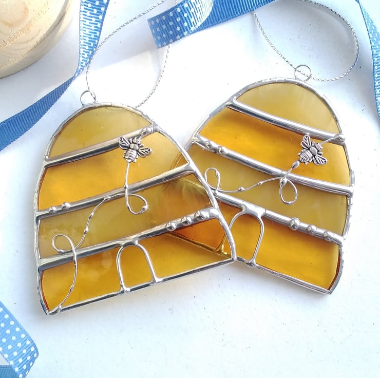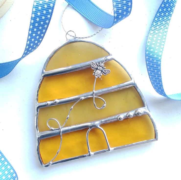 Honey coloured beehive handcrafted from beautiful amber cathedral and wispy opal stained glass and finished with copper wire details and a mini bee with silver solder. Ideal to add a touch of Springtime charm to a sunny corner or as a house-warming gift for a busy, buzzy friend!