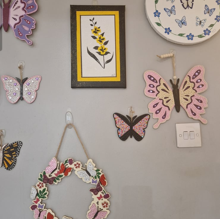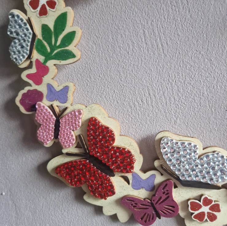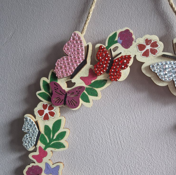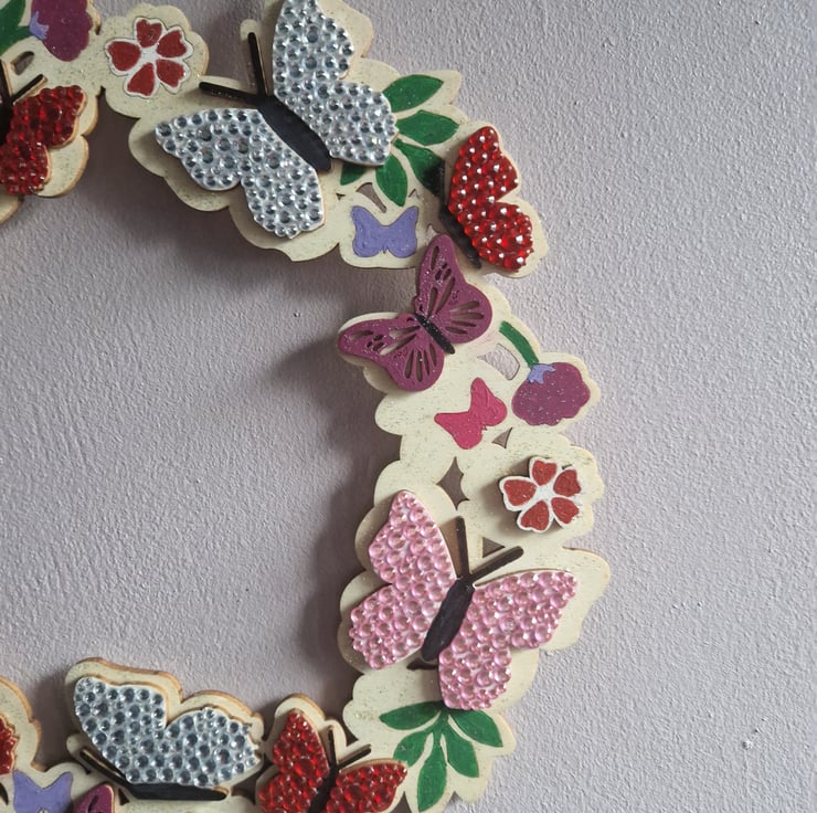 A hand crafted wooden wreath, featuring flowers and butterflies. Measuring 11 inches across, approx. The butterflies are decorated with sequins and the background embellished with sequins. I have included a picture with other items available from my shop.