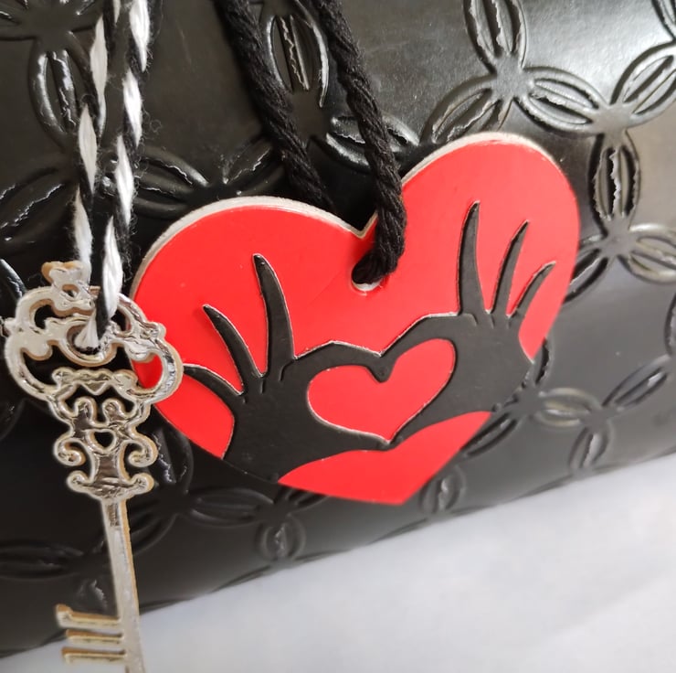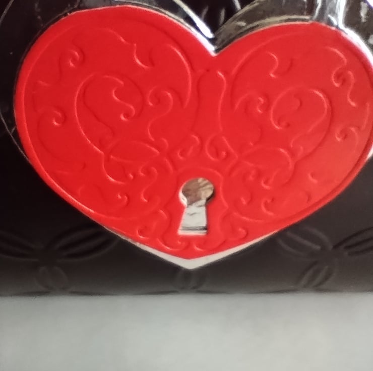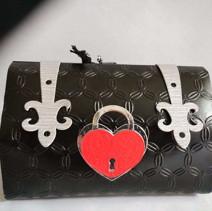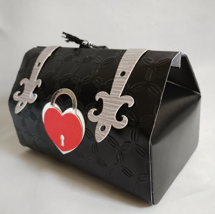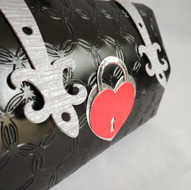 This box is made from premium quality pearl finish black cardstock which I have embossed with a pattern of entwining circles. It fastens with faux silver straps (with hook and loop fastenings) and has a heart shaped embossed faux red cardstock lock decoration to the front.