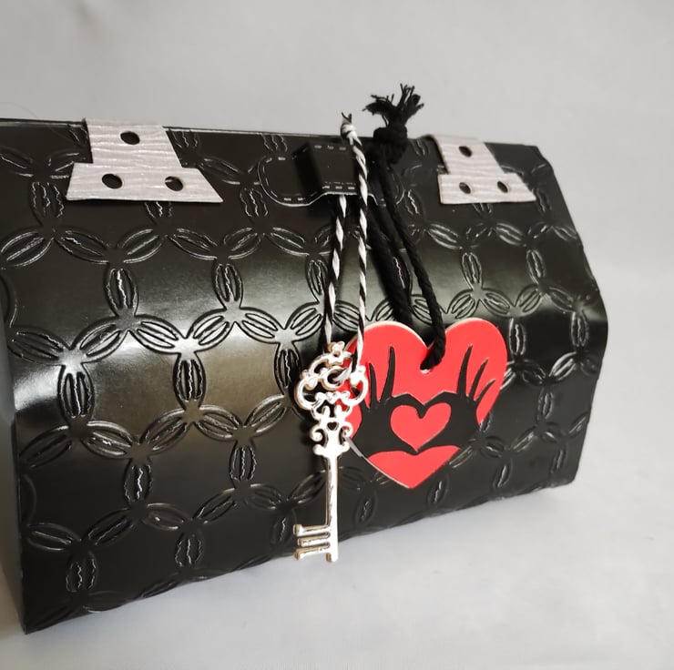 A unique handmade Valentine / Friendship Chest Style Gift Box with a red heart lock and faux strap buckles, complete with faux silver key and gift tag for you to write your message.