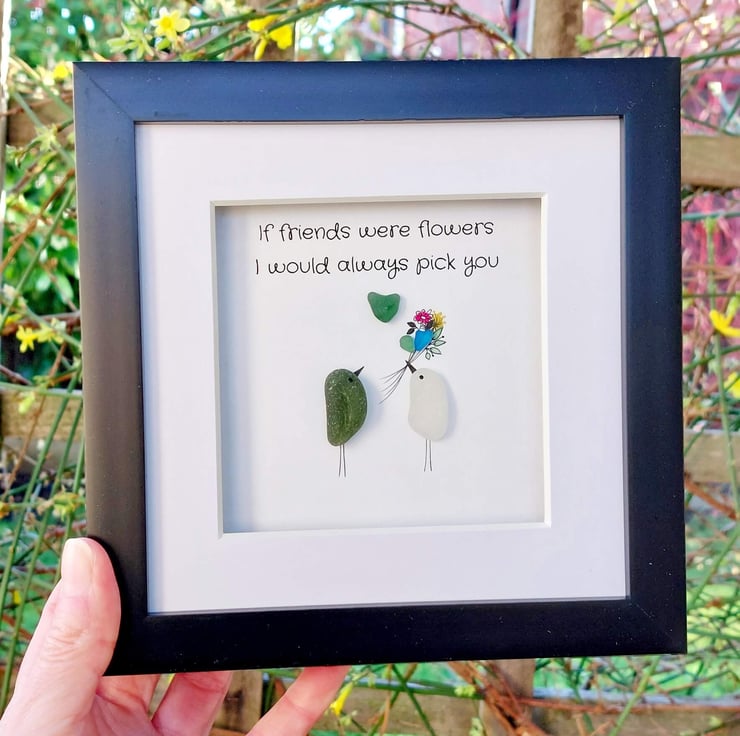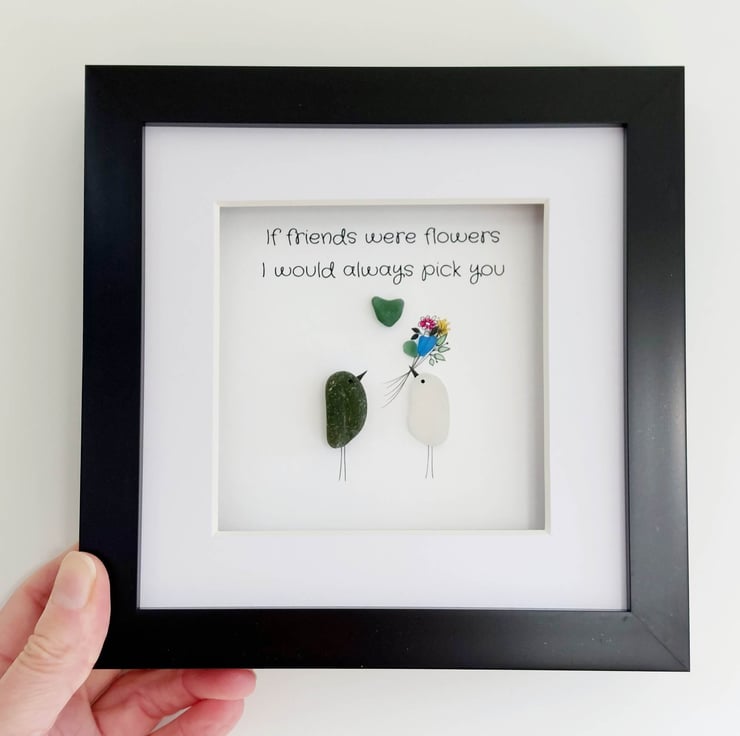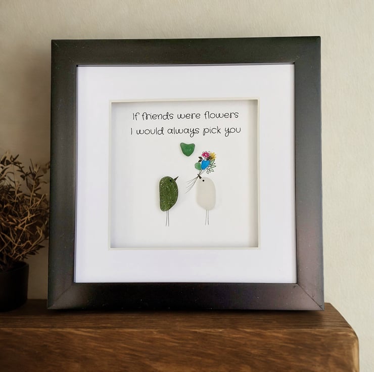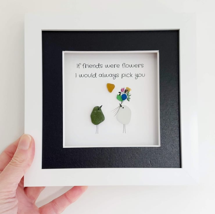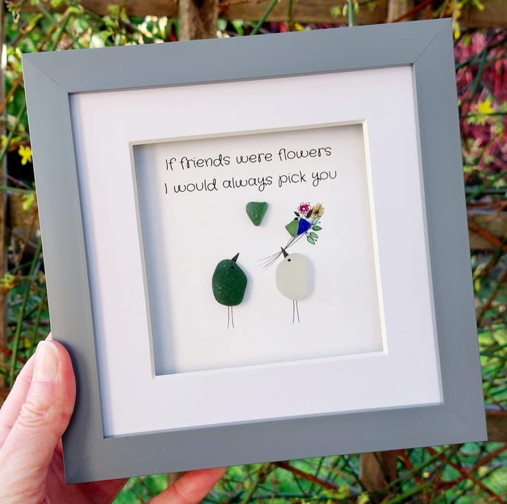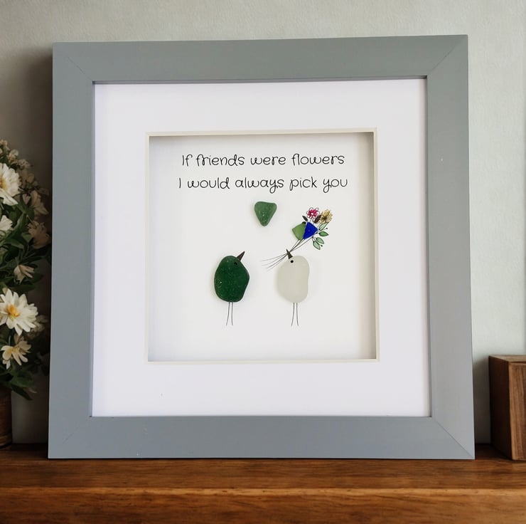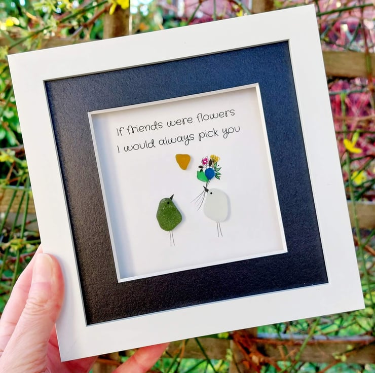 Order a unique piece of sea glass original framed wall art as a gift for your bestie. Available in a white, grey, or black 17.5cm frame with an attached stand, this design is understated, chic, and a tribute to the wonderful bond between best friends. It has been hand crafted using sea glass collected from my coastal journeys, featuring the printed message, "If friends were flowers, I would always pick you." Celebrate your bond with this beautiful gift.