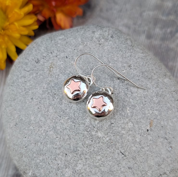 Gorgeous silver pebble earrings with copper star detail, hand made from recycled Sterling Silver using traditional silversmith techniques and given a smooth polished finish.