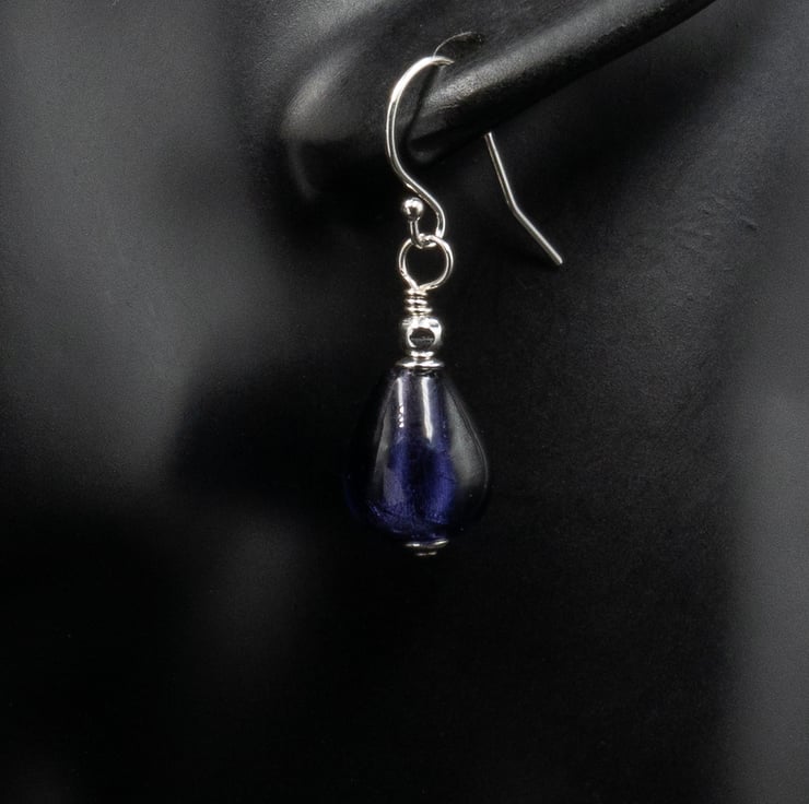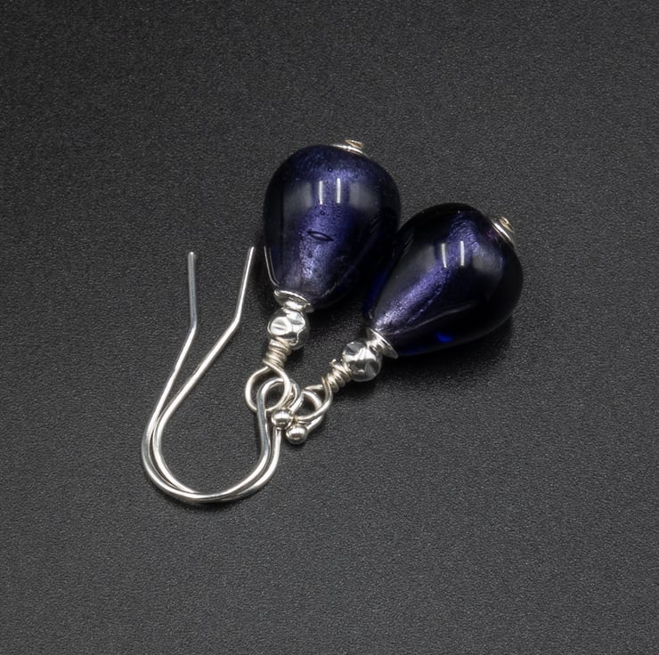 These lovely little midnight silver teardrops are made with a base of sterling silver foil encased in an outer layer of deep purple blue glass to give a pretty shimmering mix of colour.