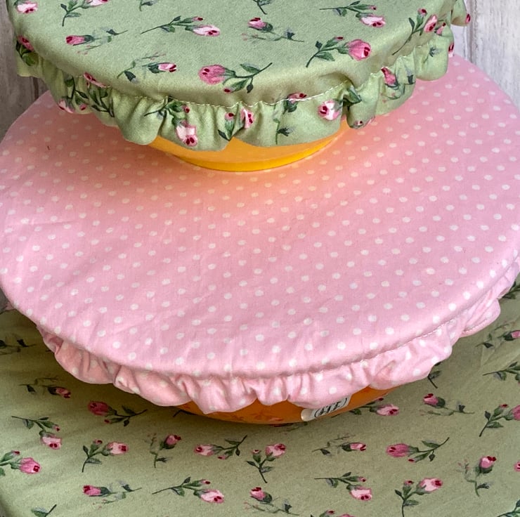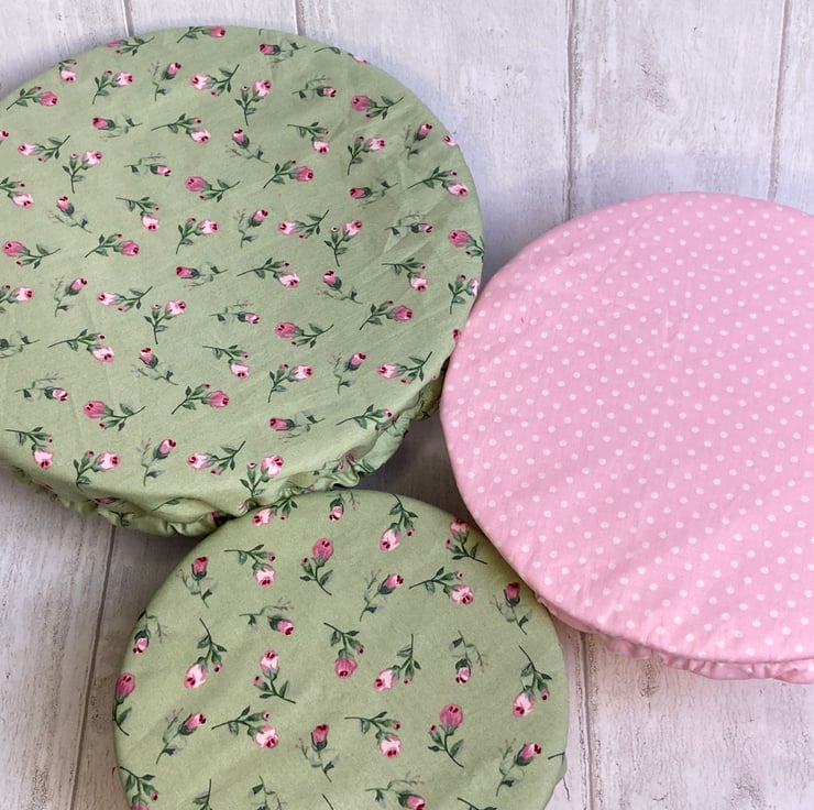 This set of 3 covers will fit bowls approximately 23cm, 19cm and 16cm (9", 7.5" and 6"). They are made from 3 pretty fabrics in sage green and pink. Two are green with pink rosebuds. The other is pale pink with white spots. The linings are pink.