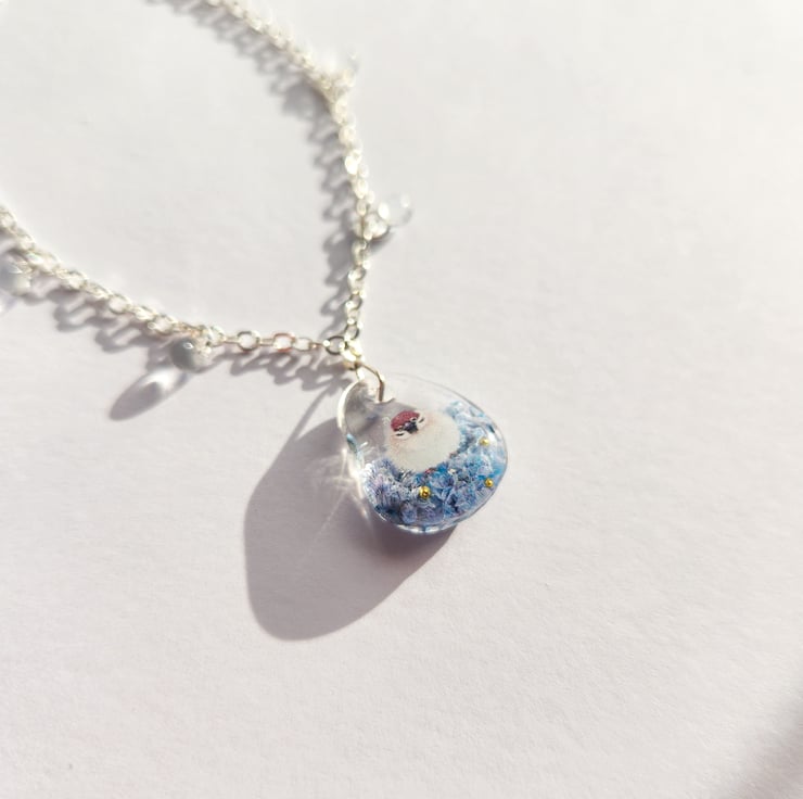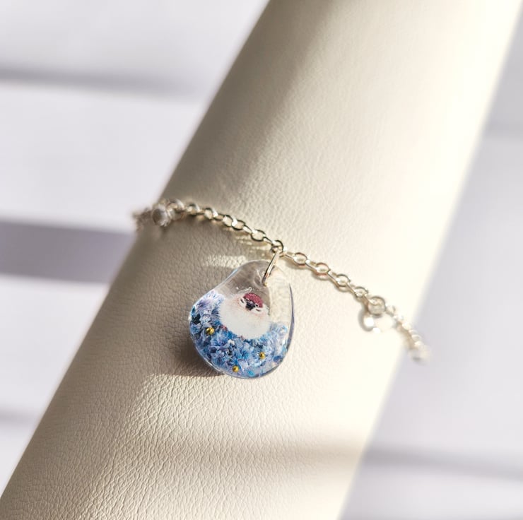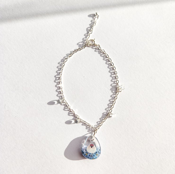 This handmade bracelet features a single hanging charm, preserving real dried flowers in resin, with a small sparrow resting gently inside. The charm moves softly with the hand.