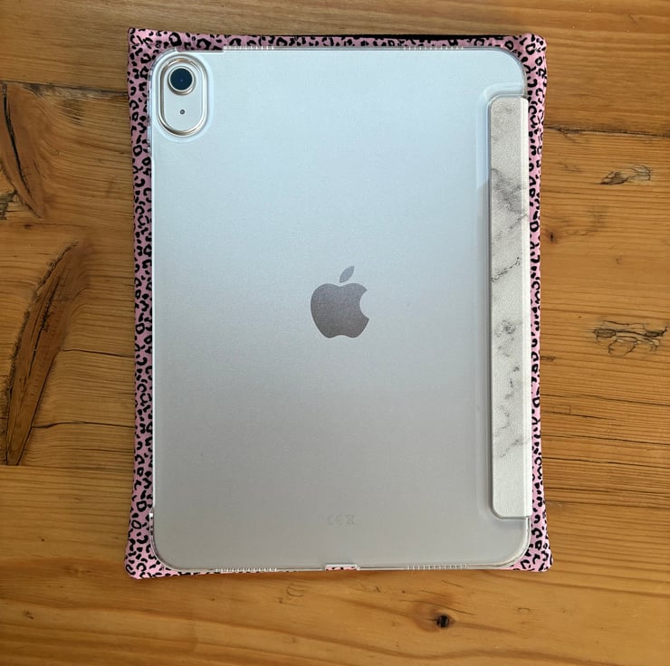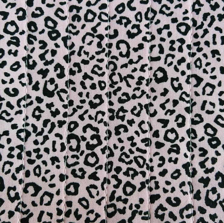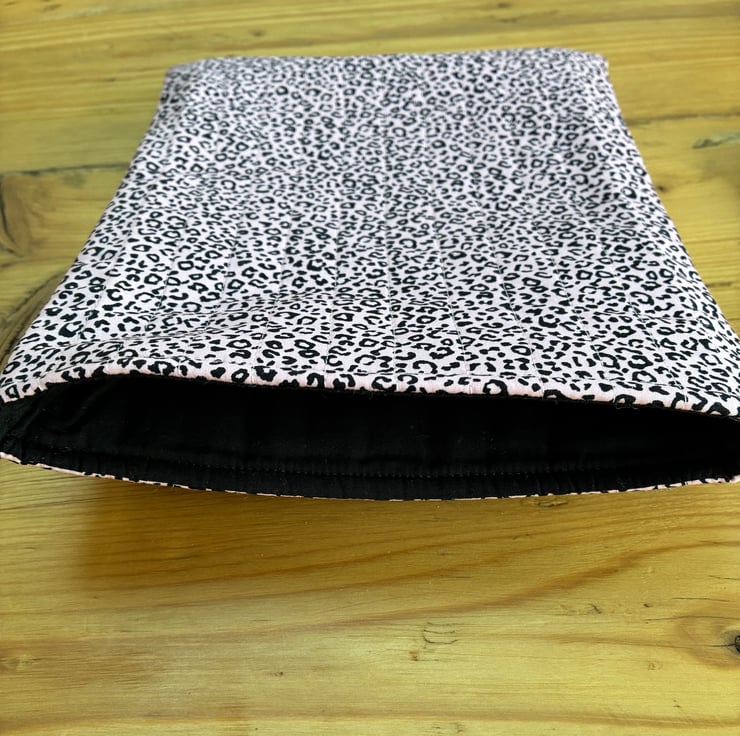 The sleeve is made in this gorgeous pink and black leopard print cotton fabric. The sleeve is quilted with pink stitching and is fully lined in plain black cotton fabric.