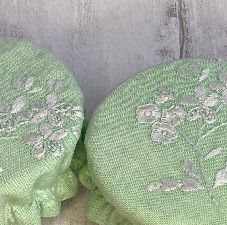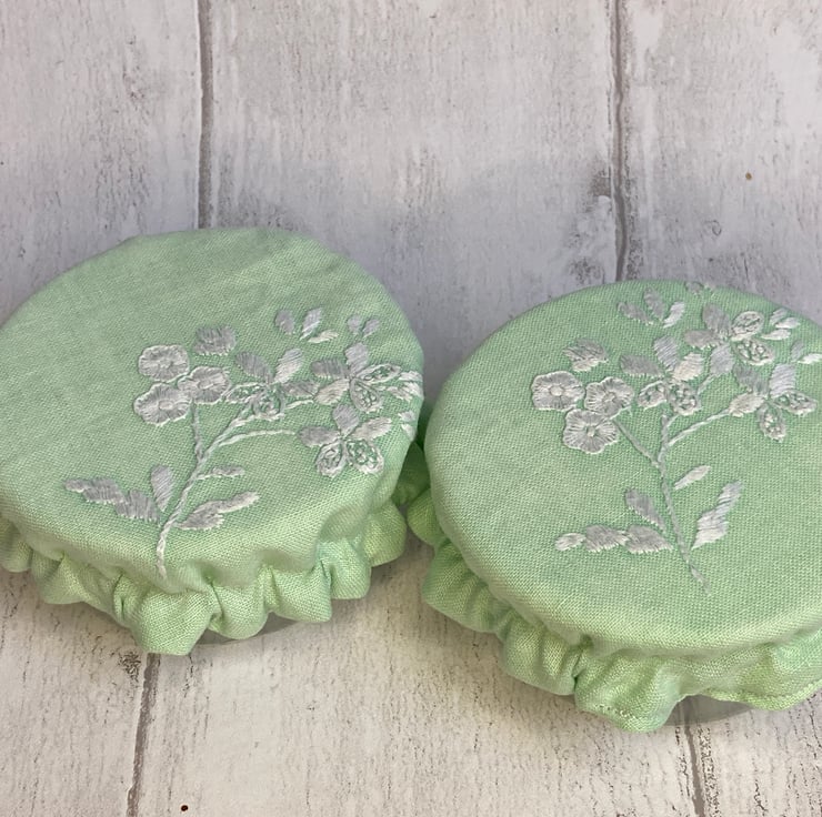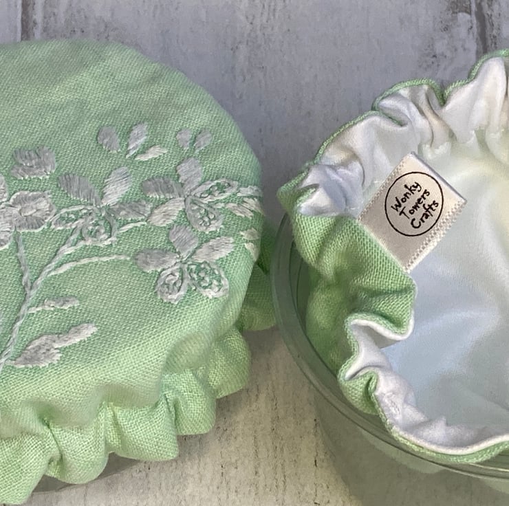 This useful pair of pot covers are made from small pieces of fabric left over from repurposing an embroidered tablecloth. They are both vintage cotton decorated with white embroidered flowers. They are lined with white PUL - a fabric that is laminated with a small amount of plastic. It is safe to be in contact with food, helps to keep it fresh but reduces the need for single-use plastics. An elasticated rim keeps the covers securely in place on your chosen dish or pot. They are washable by hand or machine, making them a hygienic option but often just a wipe with a cloth is enough. I find they are much easier to use than beeswax wraps.