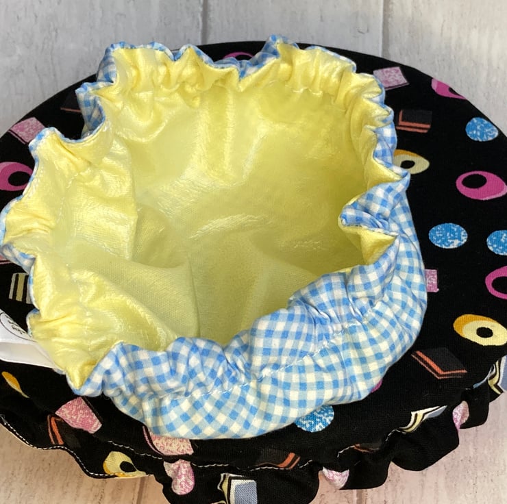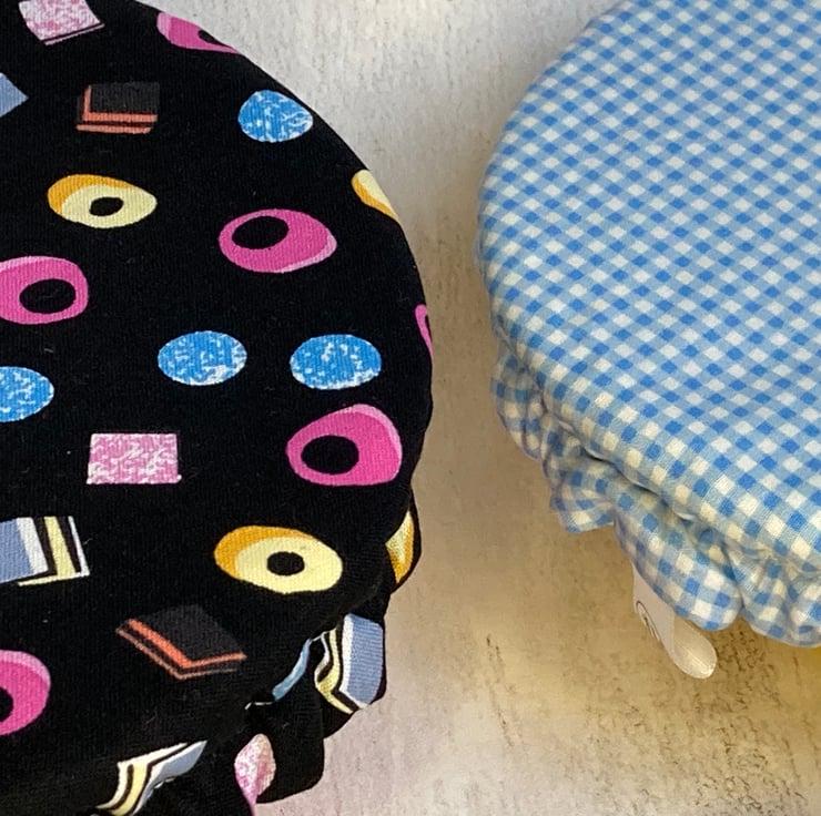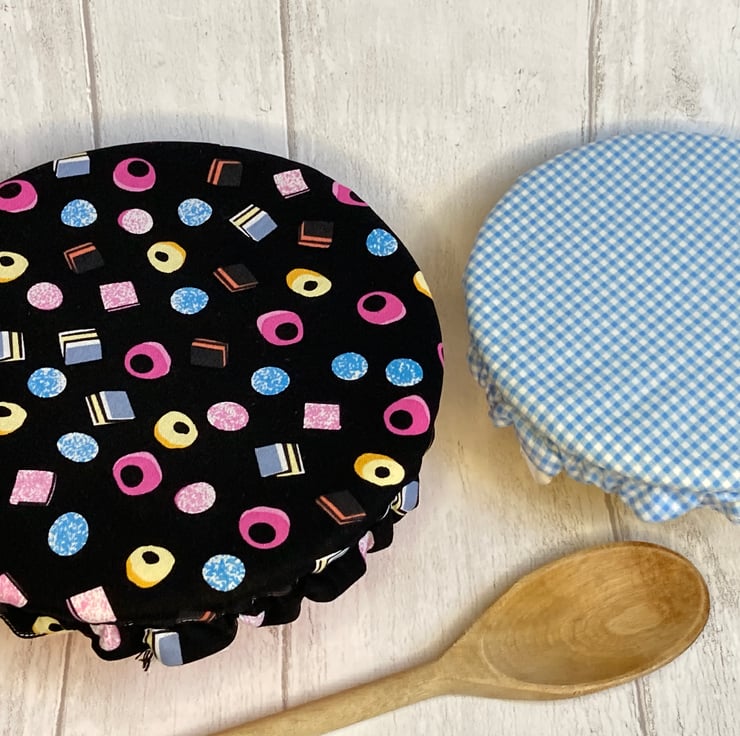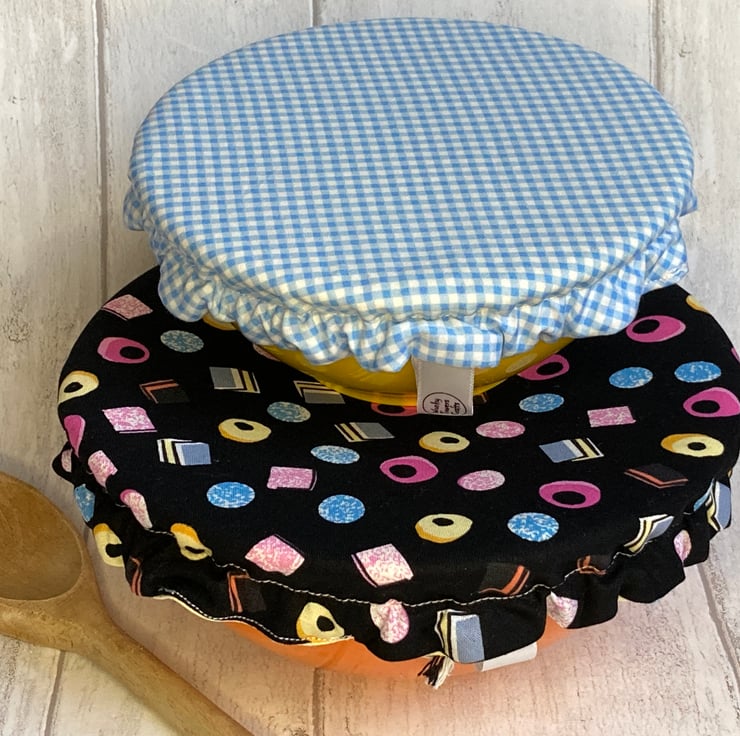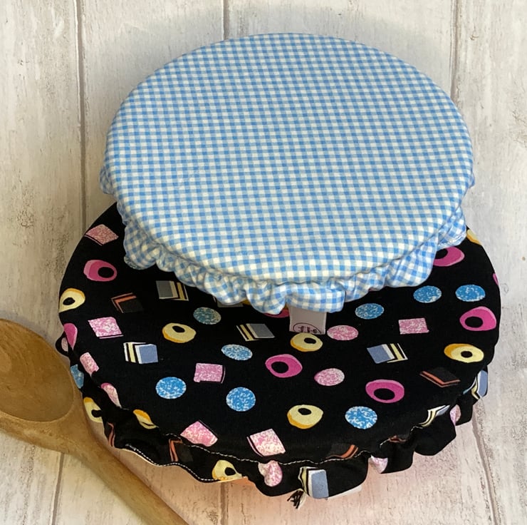 This set of 2 covers will fit bowls approximately 19cm and 16cm (7.5"and 6"). They are made from 2 co-ordinating fabrics. One is black, decorated with liquorice all sorts images. The other is blue and white check.They are both lined with yellow food-safe PUL