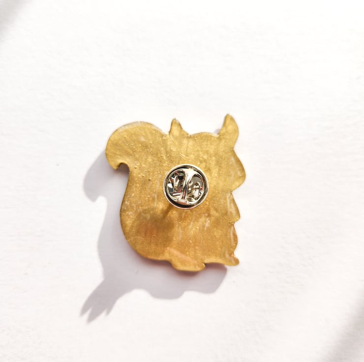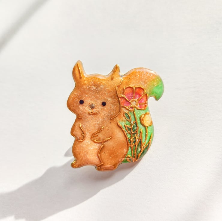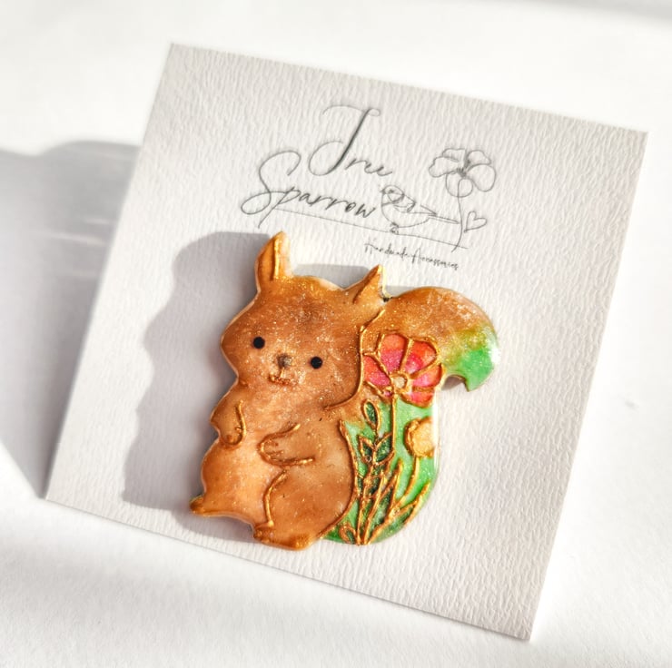 A squirrel brooch is hand-shaped, hand-painted and finished with care by hand.