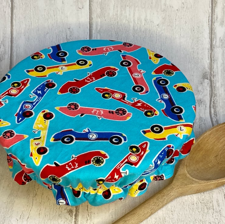 One small reusable bowl cover to fit a cereal-sized bowl. Racing cars