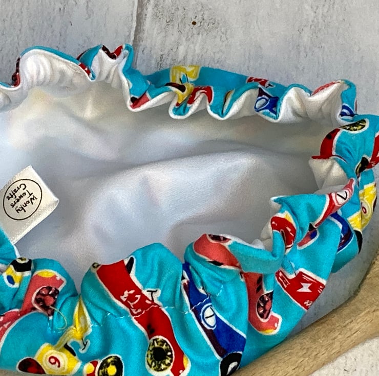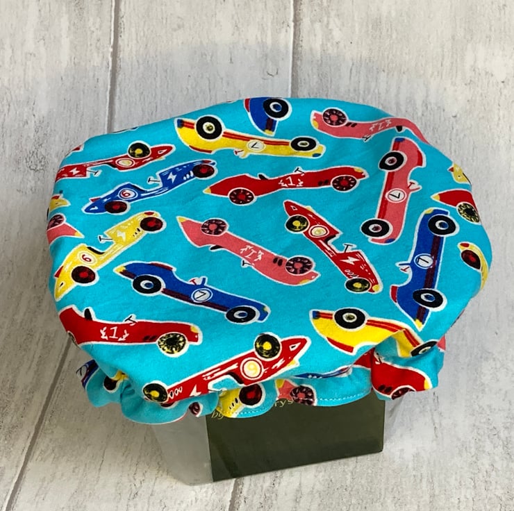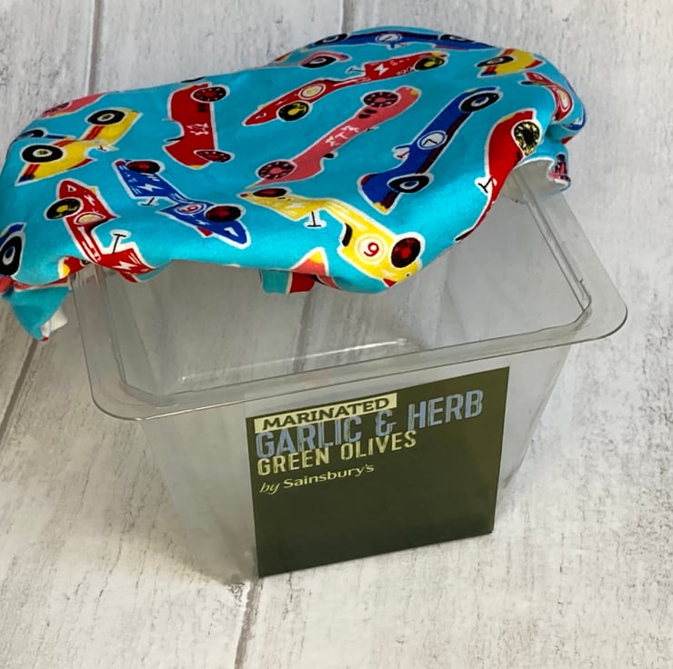 This simple bowl cover will be very useful in your fight to reduce waste. Designed for keeping food fresh, it is ideal for single portion left-overs. This small bowl cover will fit bowls about 6" or 18cm in diameter and is ideal for square pots of olives with no lid. The cover is made from a turquoise cotton decorated with colourful racing cars. It is lined with white food-safe PUL – more details below. Elastic threaded into the hem holds the cover securely on your chosen bowl. It can be used in the fridge or freezer but is not suitable for microwave use. If soiled, the lining can be wiped clean or the whole cover can be washed in the washing machine and air dried.