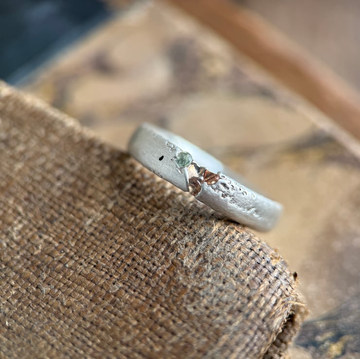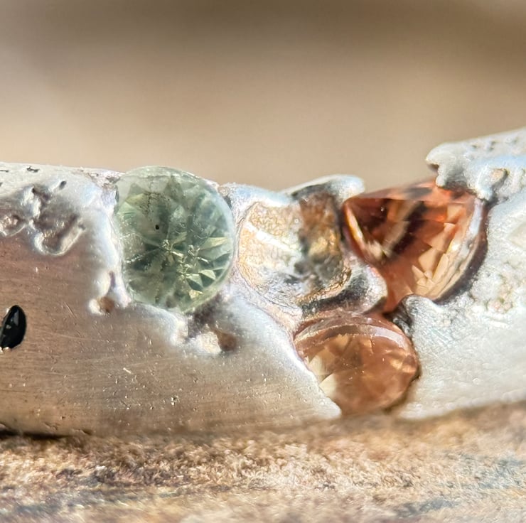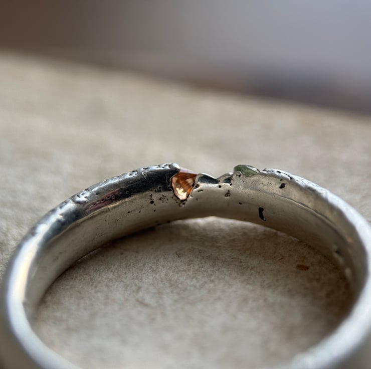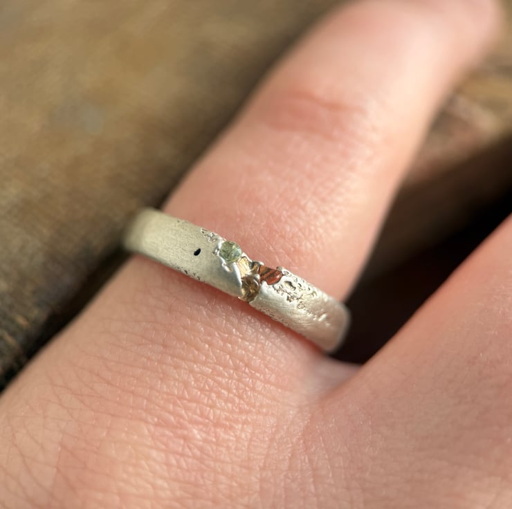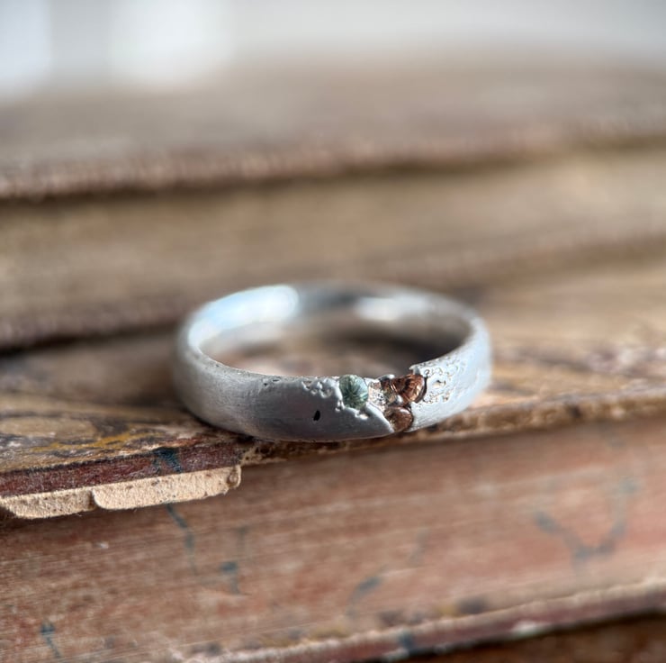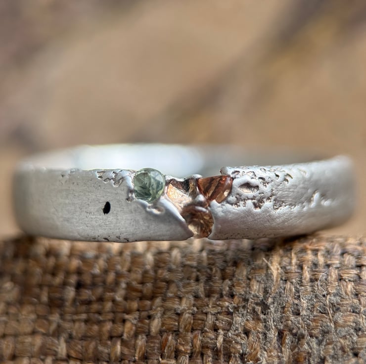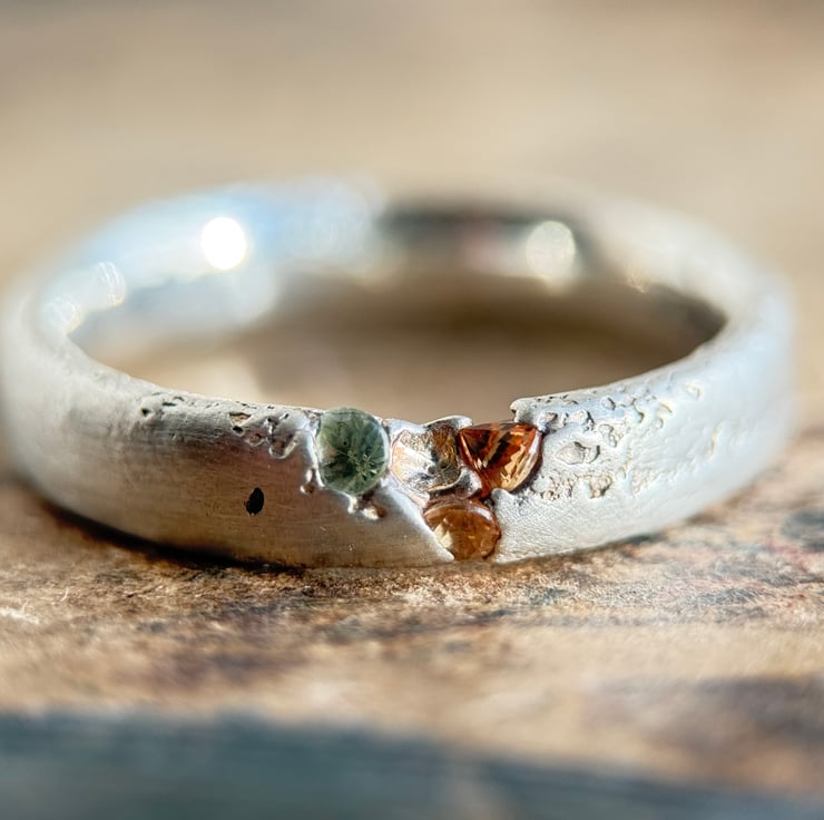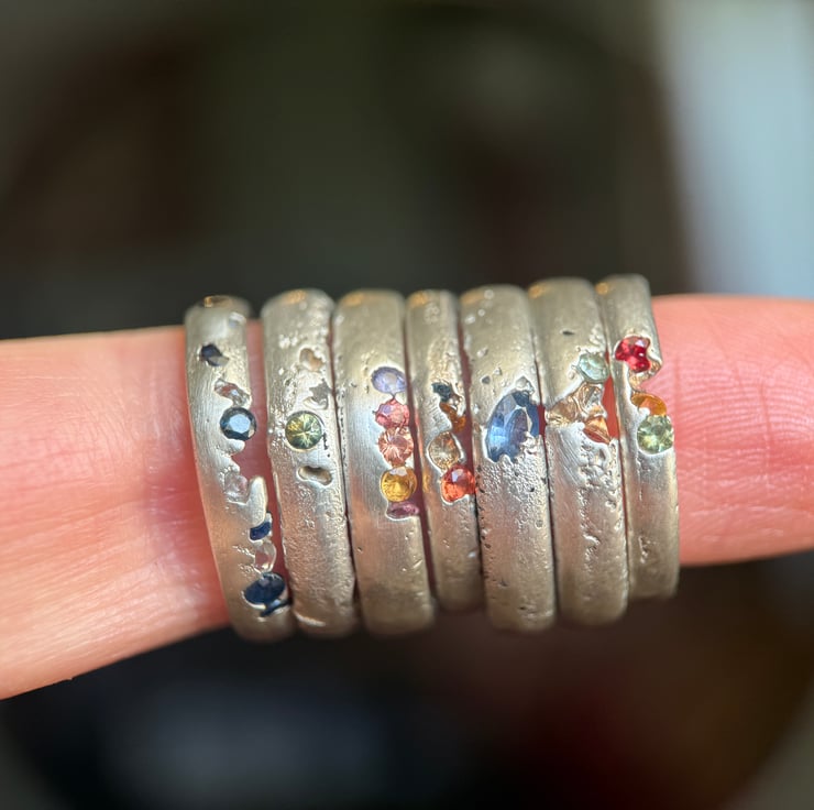 A one of a kind recycled Sterling silver sapphire ring, sand cast with three natural sapphires cast directly into the organic, matte oval shaped silver band.