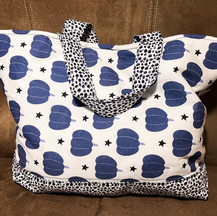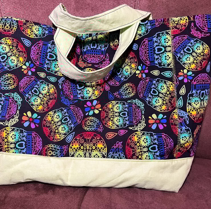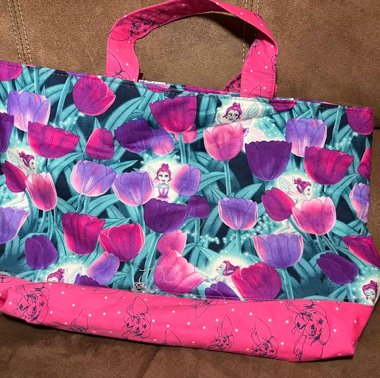 Handmade sewn tote bags, each with a clasp attachment, 2 pockets inside and a zip.