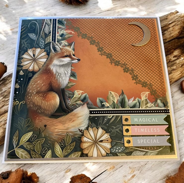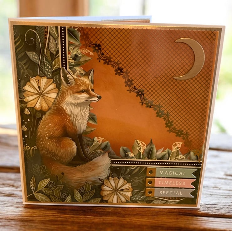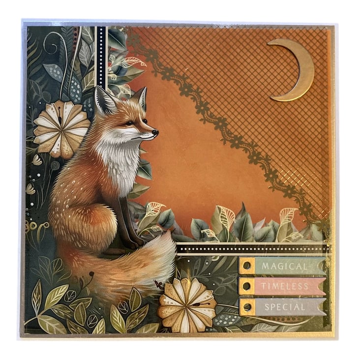 A magical woodland fox takes centre stage on this handmade 6 x 6 inch greeting card, surrounded by rich autumn tones, lush foliage, and elegant gold accents. The front design features layered details with a gold foiled acetate panel, a crescent moon, and the words timeless, magical, special that give this card a mystical, storybook feel.