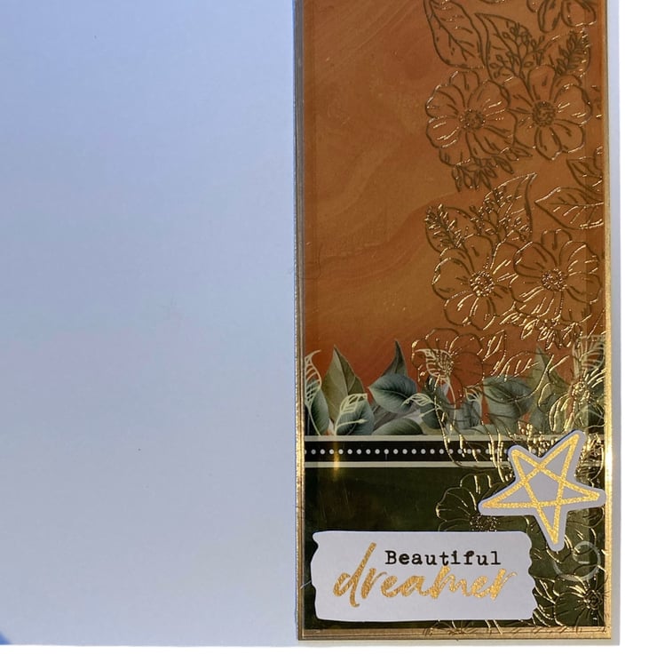 The inside is beautifully decorated as well, with coordinating florals, gold embossing, and a heartfelt “Beautiful dreamer” sentiment—making this card just as special inside as it is on the front.