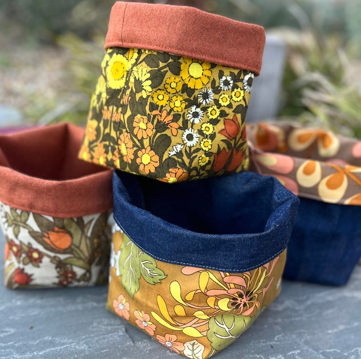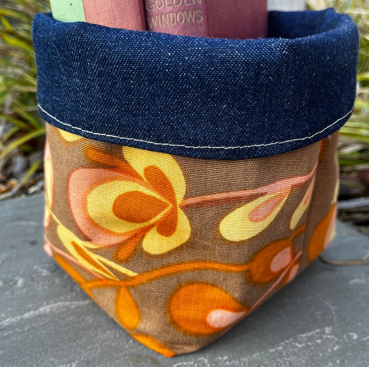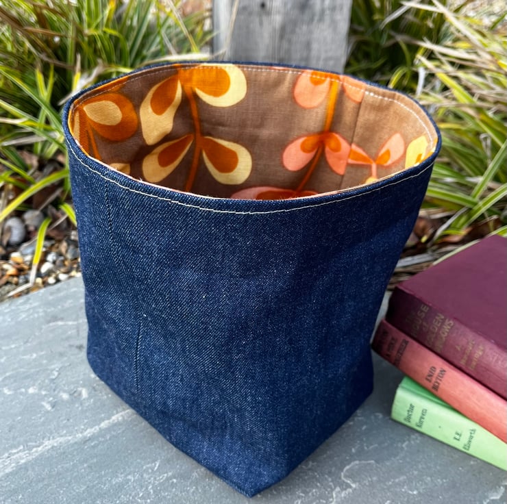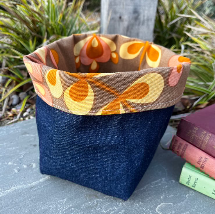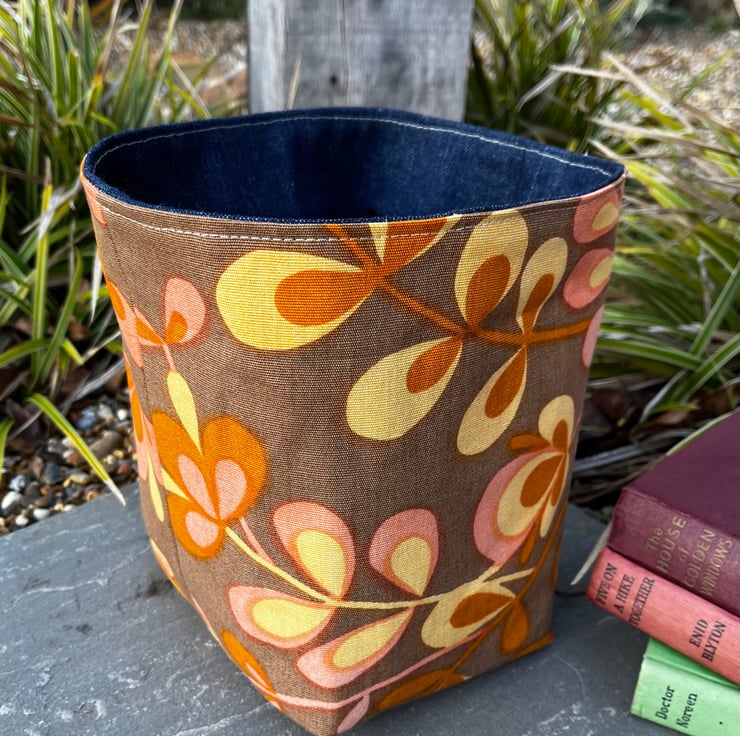 Reversible fabric storage basket made from reclaimed vintage cotton from a bright retro curtain and dark blue denim . A layer of interfacing between the layers makes it sturdy. Can be used with a turn-down to make the most of the contrasting fabrics.