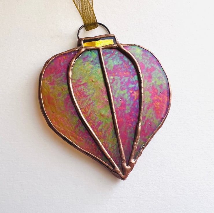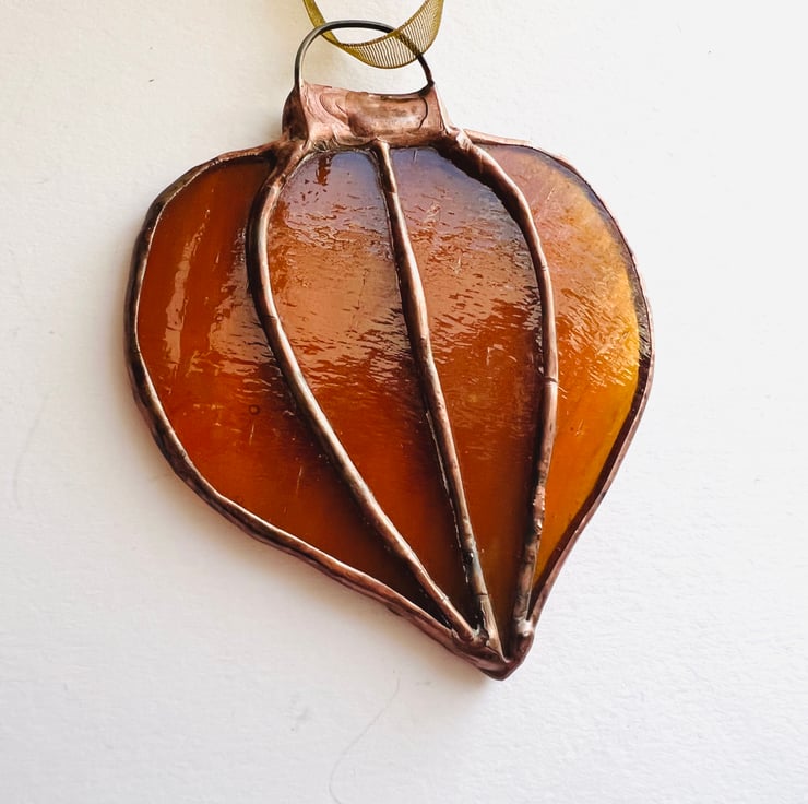 A beautiful amber iridescent stained glass Christmas bauble with a gold mirrored top and copper loop. The glass is a Matt iridescent when light shines onto it and then a rich amber when light shines through it. Each bauble is finished with a n aged copper patina that is perfect for the warm tone of this glass.