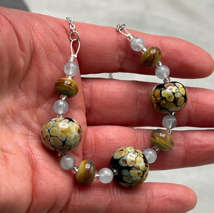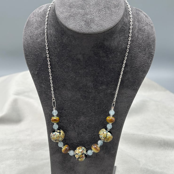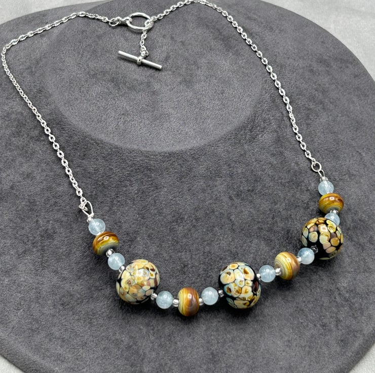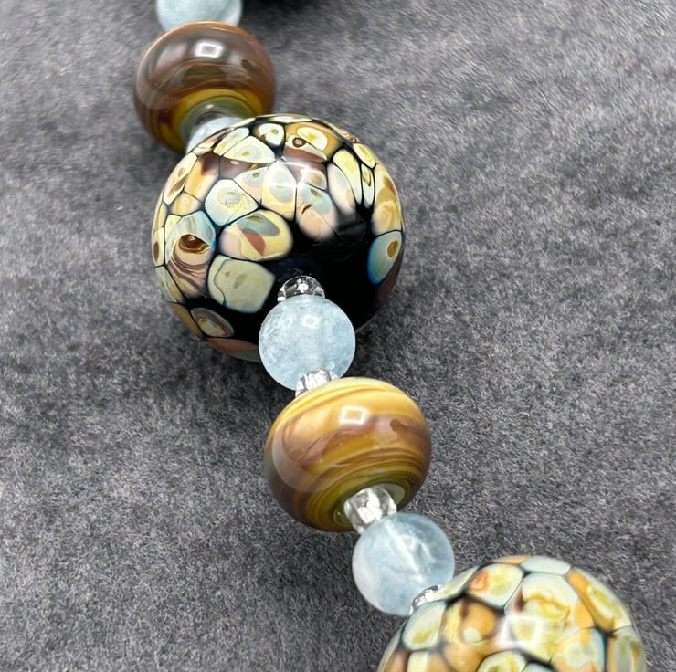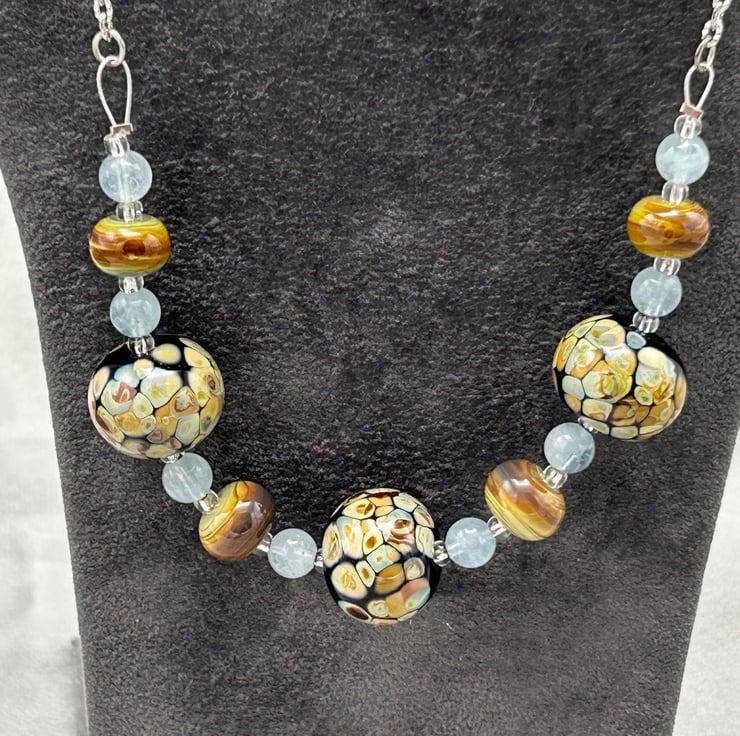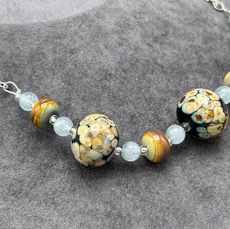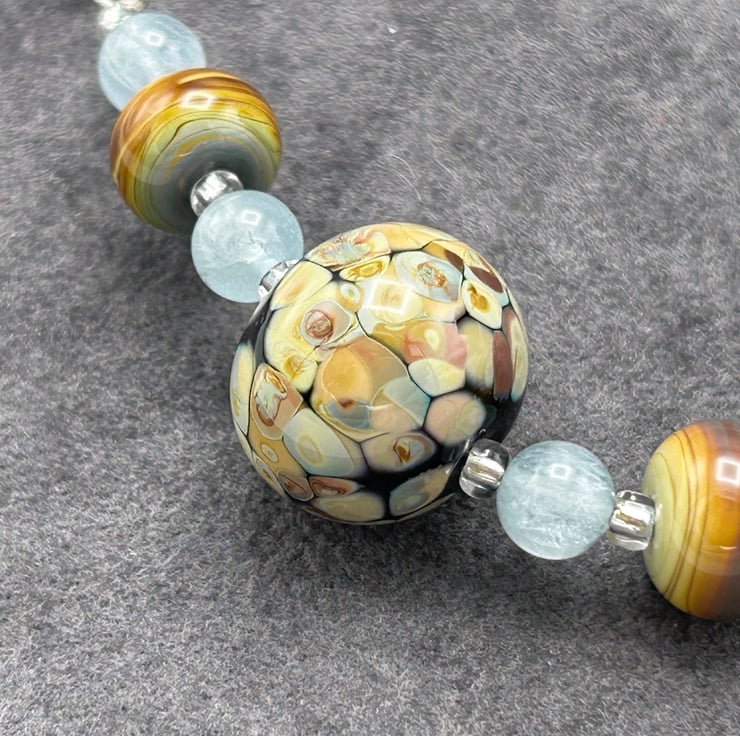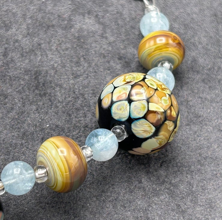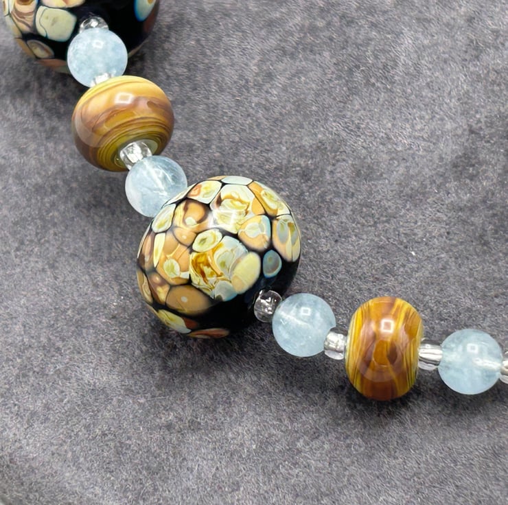 7 of my own handmade lampwork glass beads are used in this design, three of which have an ink blue transparent base with small pieces of Raku glass melted flat onto them, and four which are multi glass, all of which react in the flame and during annealing to give the fantastic colour variations seen. These have been strung on nylon covered silver wire along with silver lined seed beads and natural aquamarine balls.