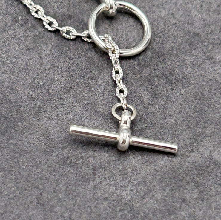 The necklace length with its silver plated chain and toggle and bar clasp is 18 1/2".