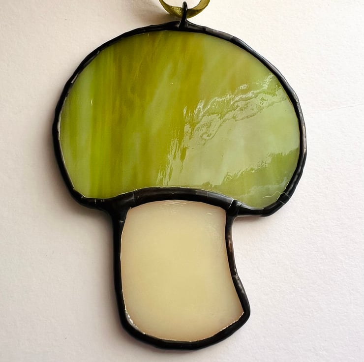Stained glass toadstool measures approximatey 8cm tall and 6cm and suspended from a matching ribbon.