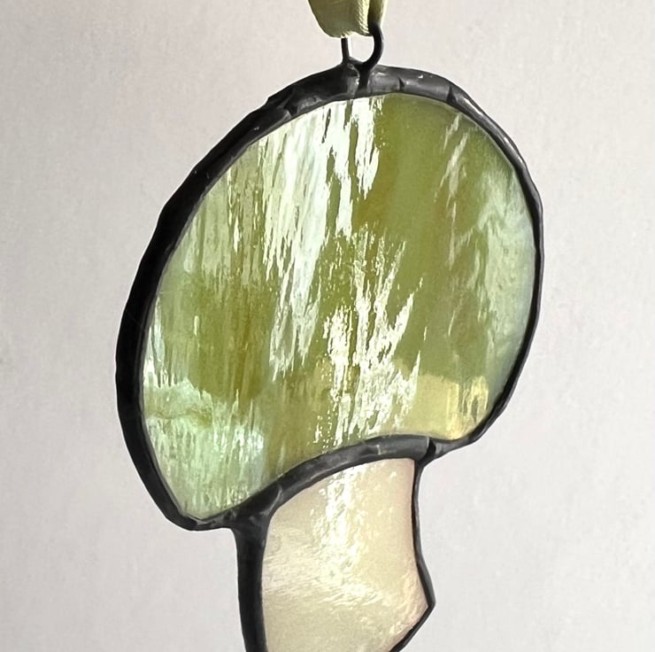 Adorable stained glass toadstool in a beautiful wispy opal chartreuse vintage glass. One of a kind as the is is made from an out of print glass sample.