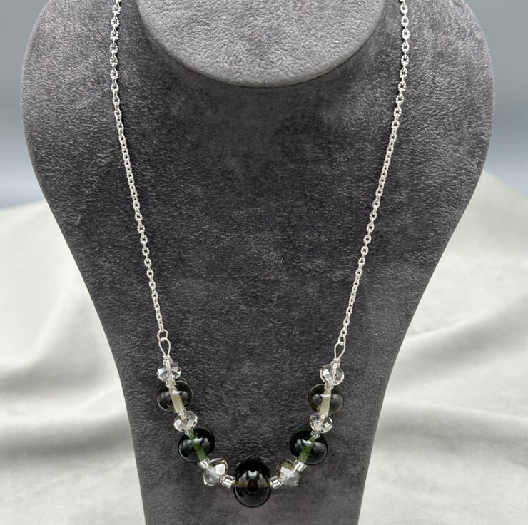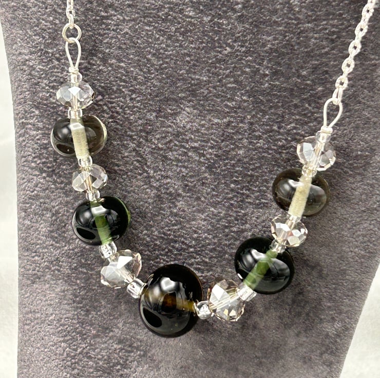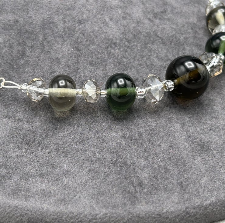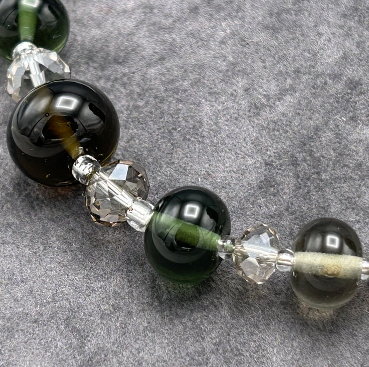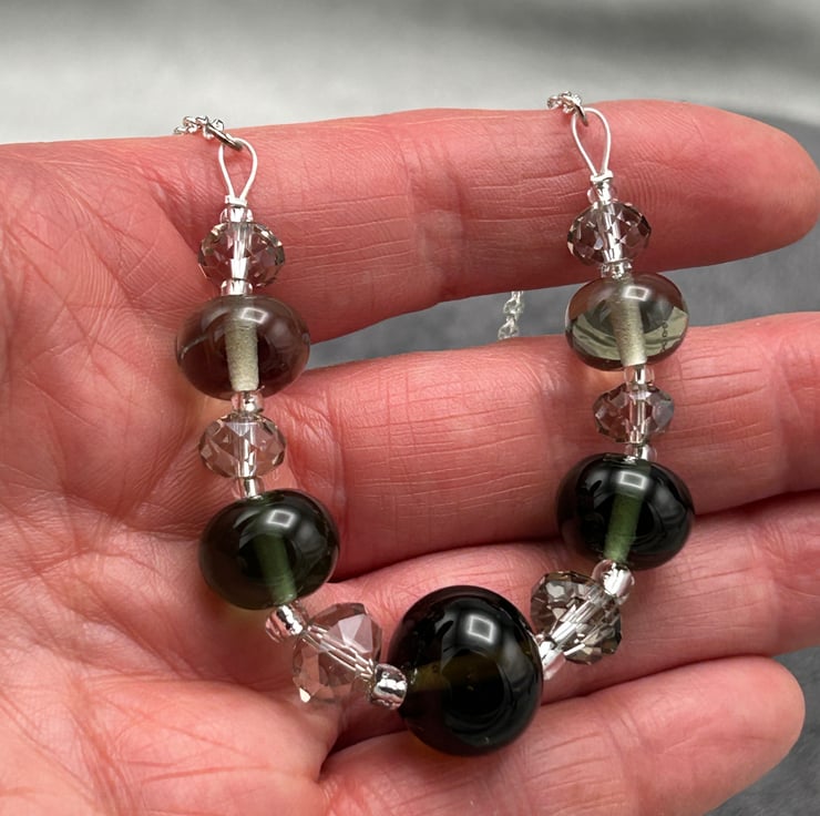 5 of my handmade lampwork glass beads have been lovingly created in the flame to be used in this design; they are in different smokey grey shades-some are more greeny, others more towards brown. I used crystal beads in the same palette for extra sparkle and silver lined seed beads and with the silver plated chain and heart shaped toggle and bar clasp added the necklace is 18" in length.