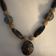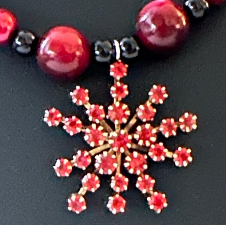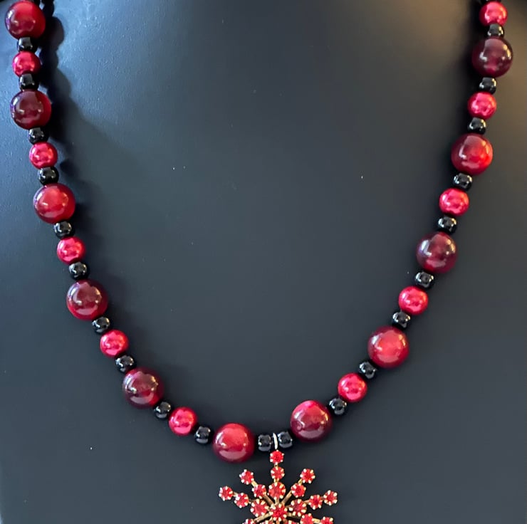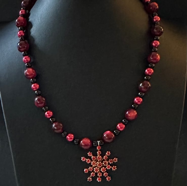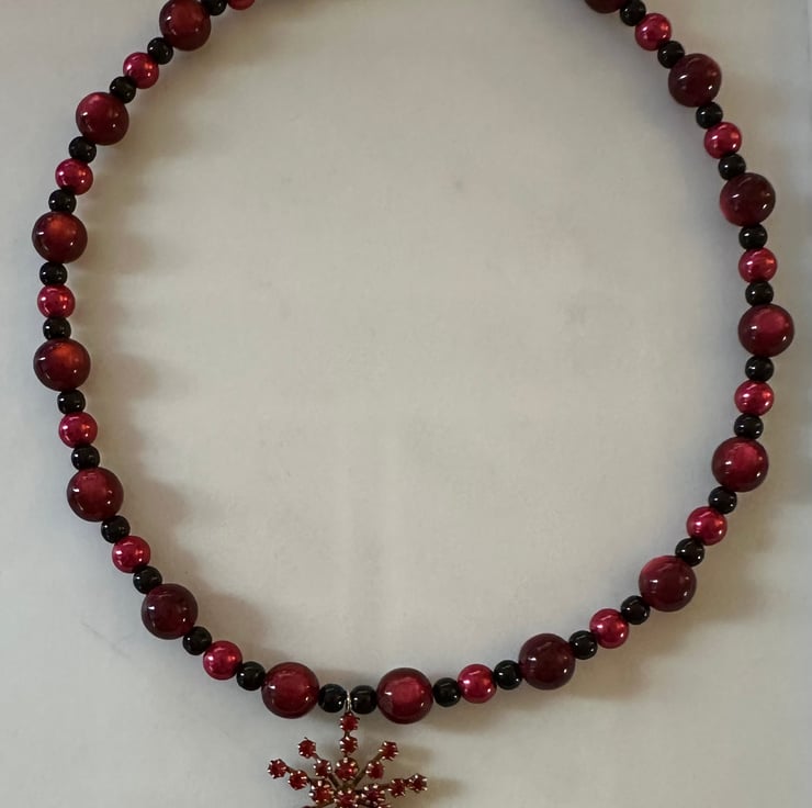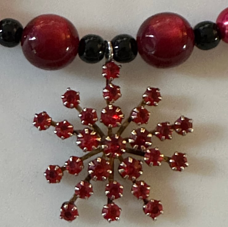 Beaded necklace made using a flexible wire, acrylic beads and a gold tone metal charm with small ruby coloured glass stones. It’s approximately 21” long with a lobster claw clasp. The pendant is approximately 1.5” long. Comes boxed.