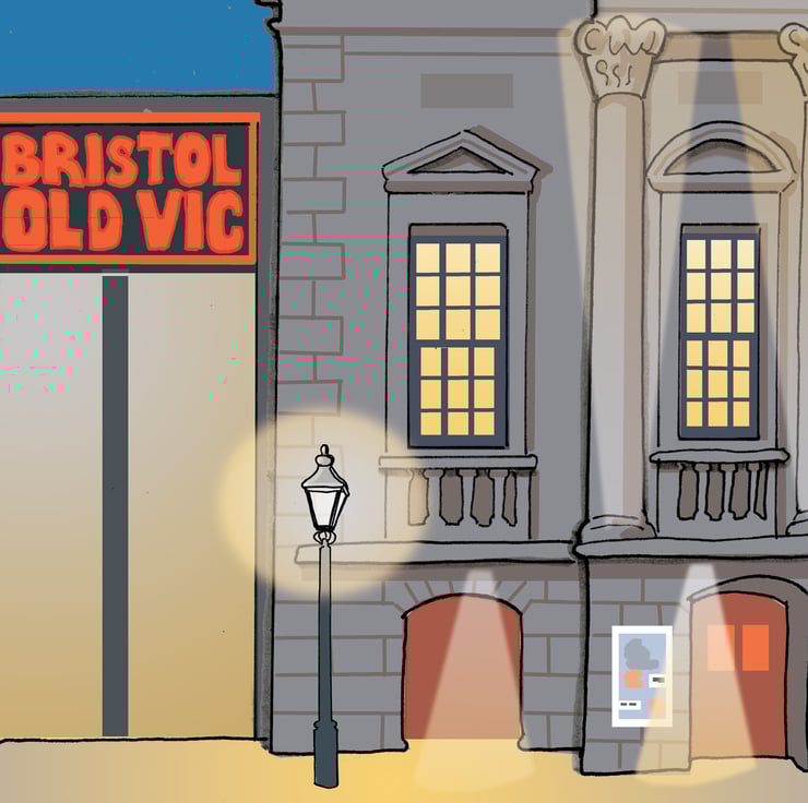 Illustrated poster of Bristol's Old Vic Theatre at night, from my original artwork.
