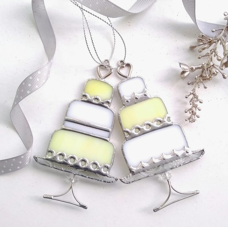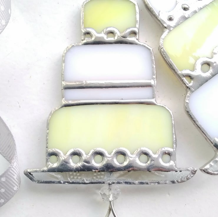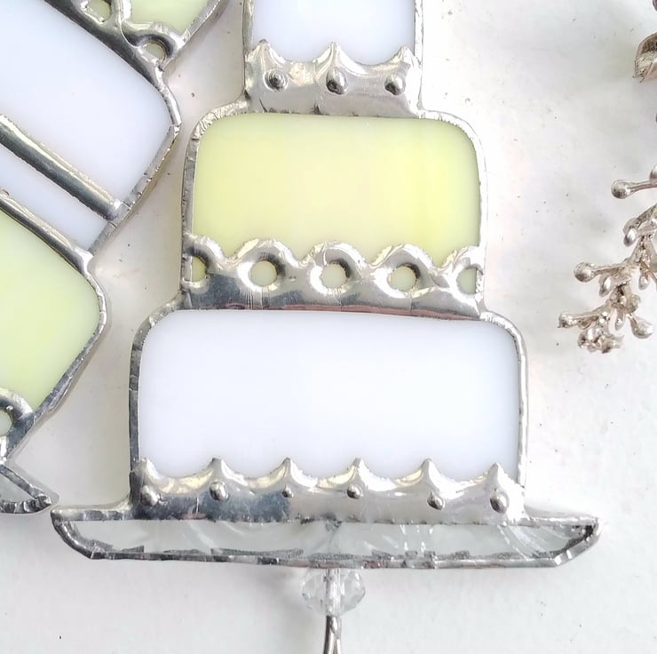 Each cake is hand crafted from pastel lemon and creamy white Oceanside glass. Adorned with polished silver overlays and decorative solder details for extra sweetness!