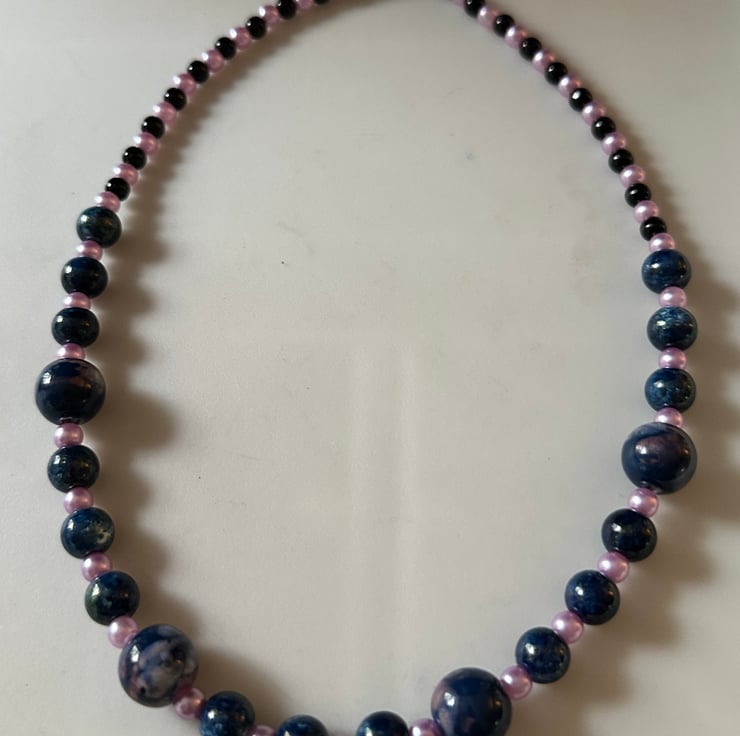 Beaded necklace made using porcelain and acrylic beads. Approximately 20” long with a lobster claw clasp. Comes nicely boxed ready for gifting.