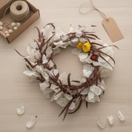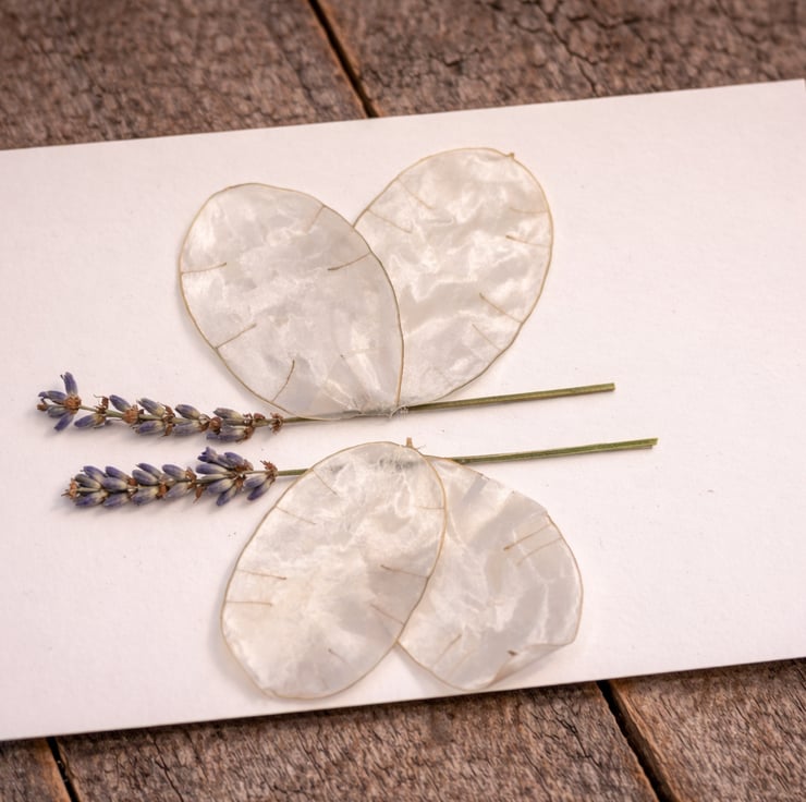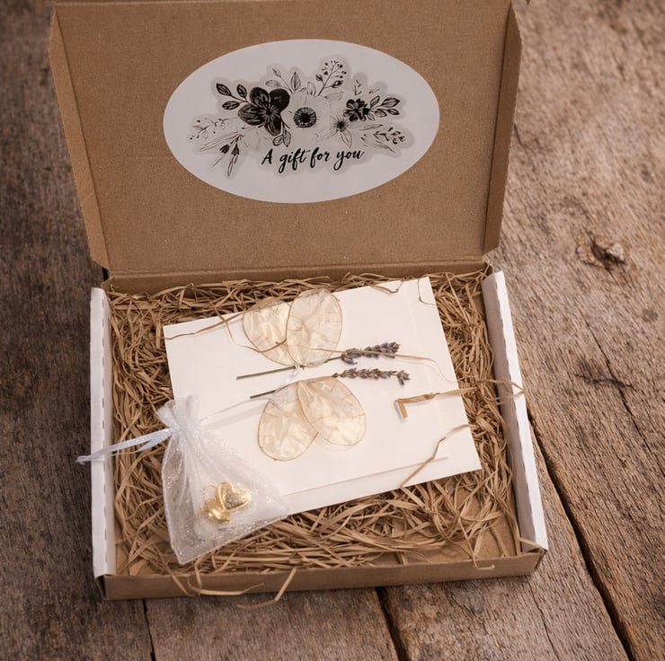 Inside the box is a white folded card decorated with pressed botanical elements, including translucent lunaria (honesty) seed pods and a small sprig of dried lavender. Resting beside the card is a pair of delicate handmade earrings, presented in a sheer white organza drawstring pouch. The earrings appear to feature small clear glass spheres with dried botanical details inside, finished with gold-toned hooks.