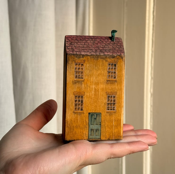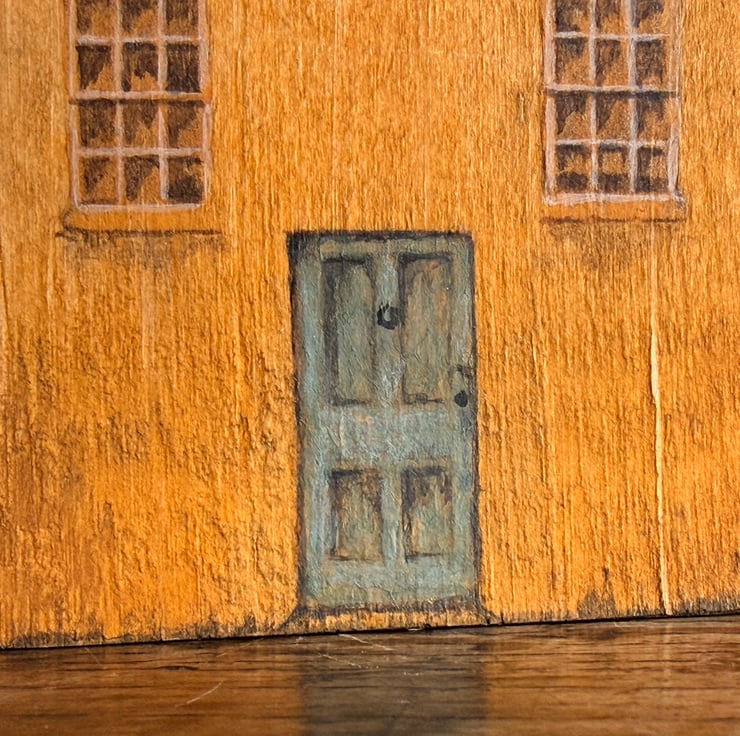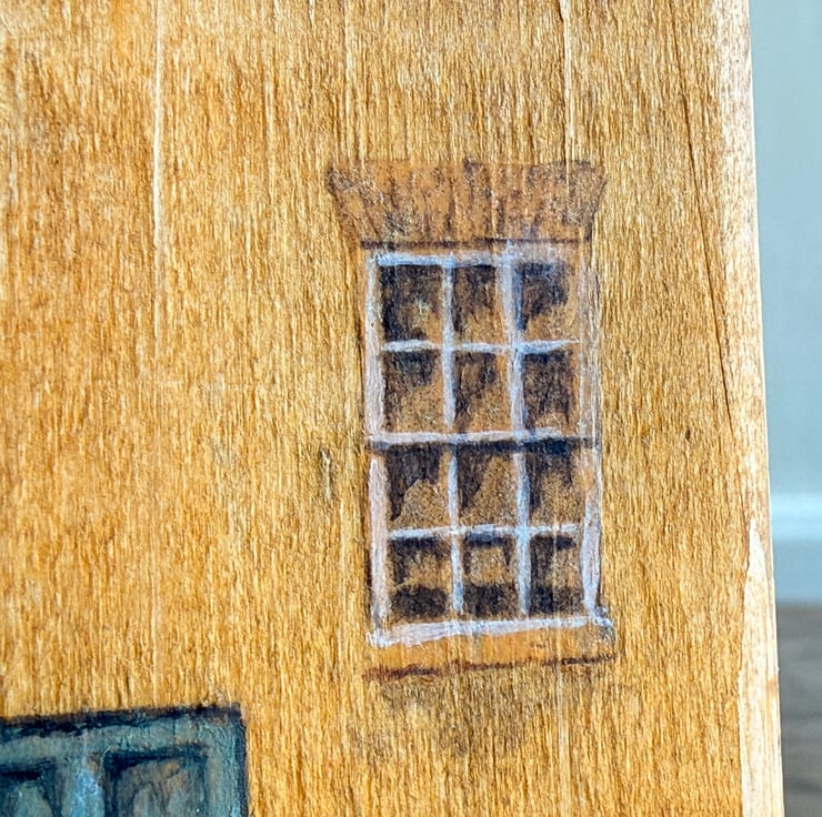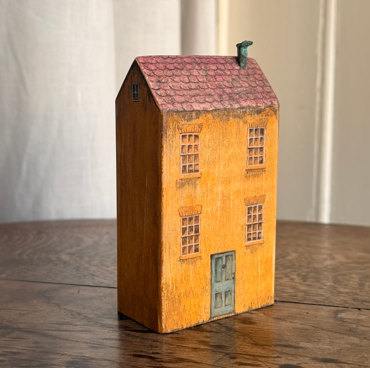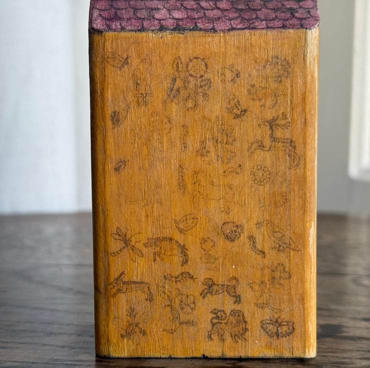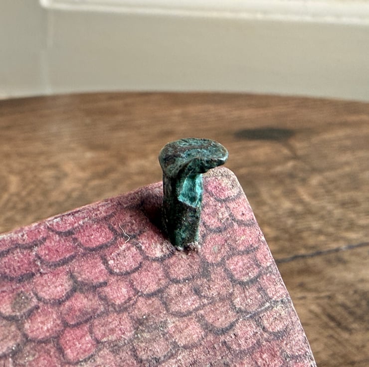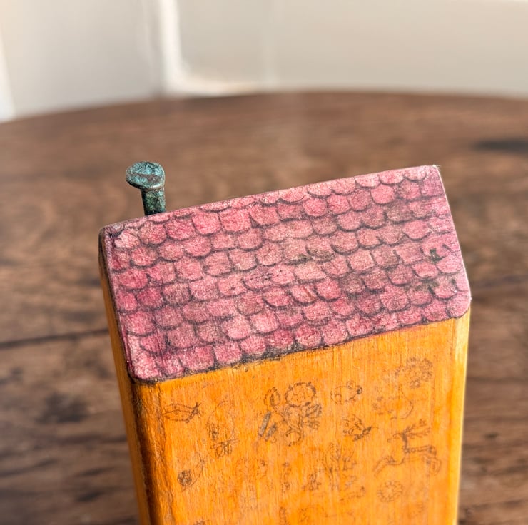 This little wooden house made by Gail, is constructed from wood left over from our property renovations with a copper nail from one of our mudlarking expeditions for a chimney.