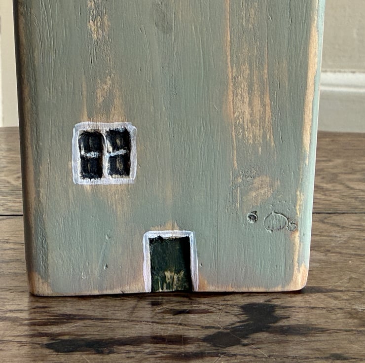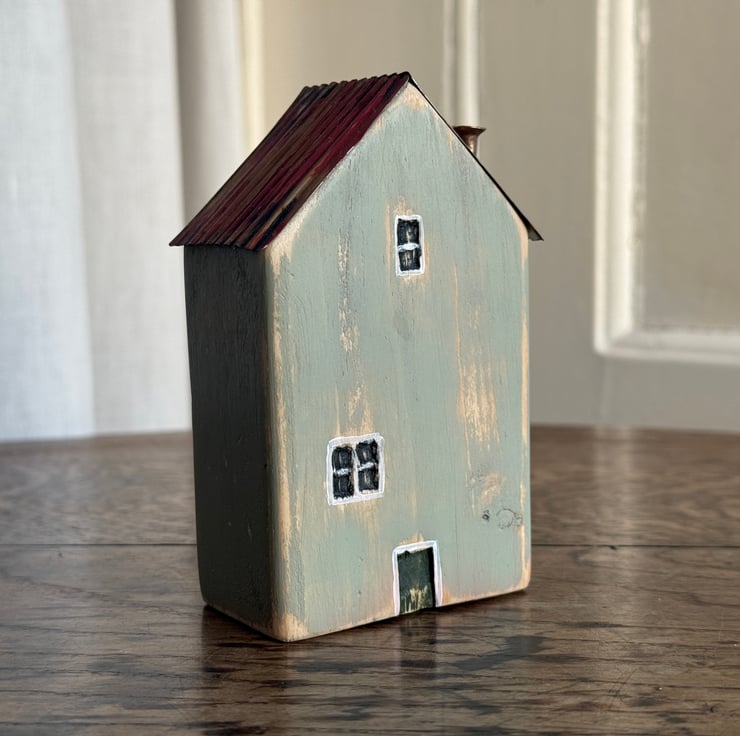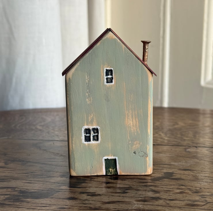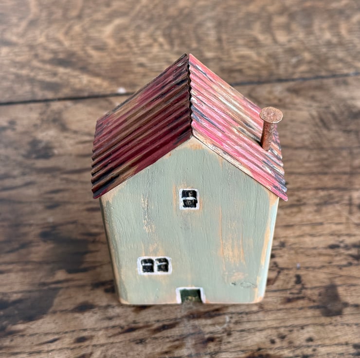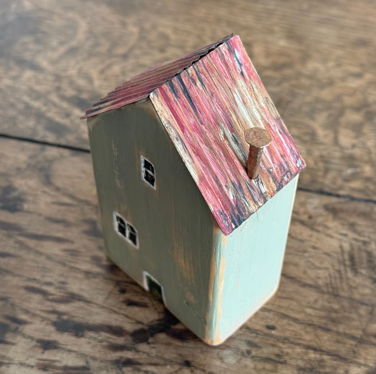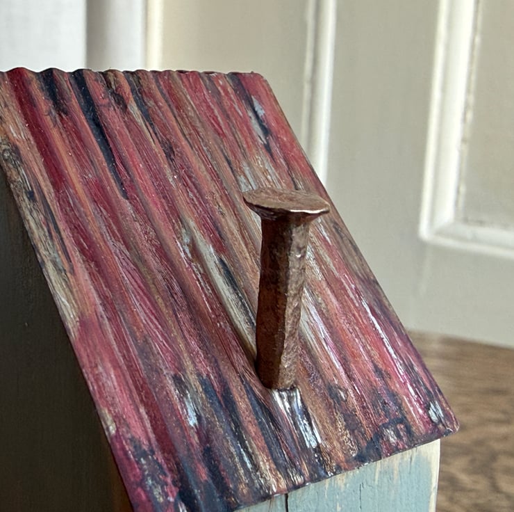 This little wooden house made by Gail, is constructed from wood left over from our property renovations and a copper nail from one of our mudlarking expeditions. The roof is made from a bean tin.