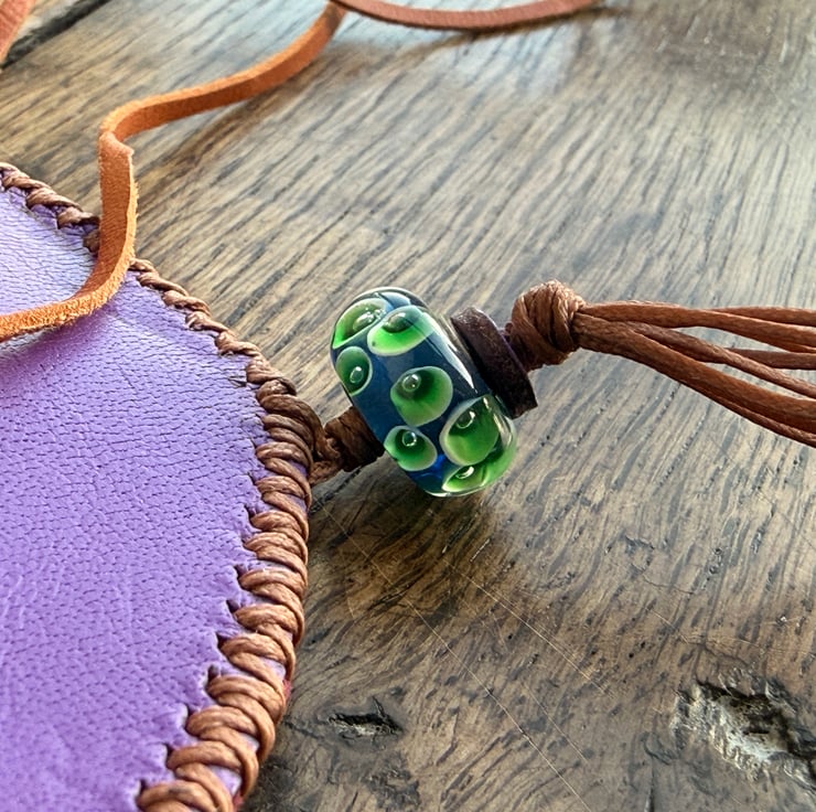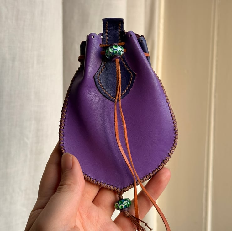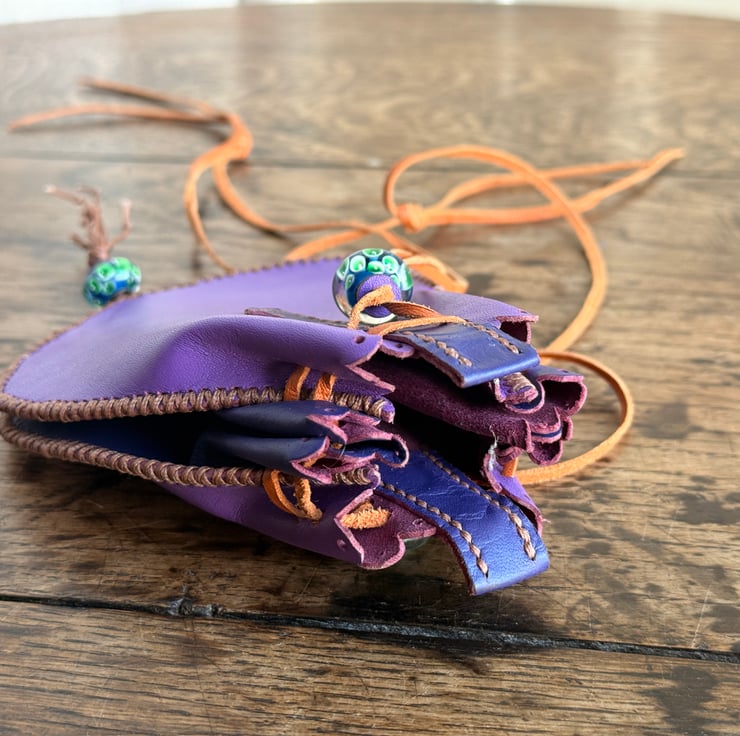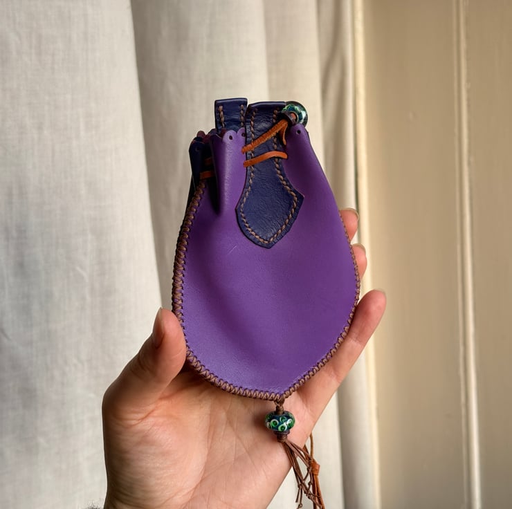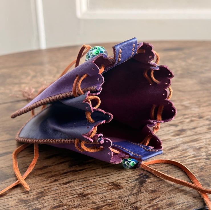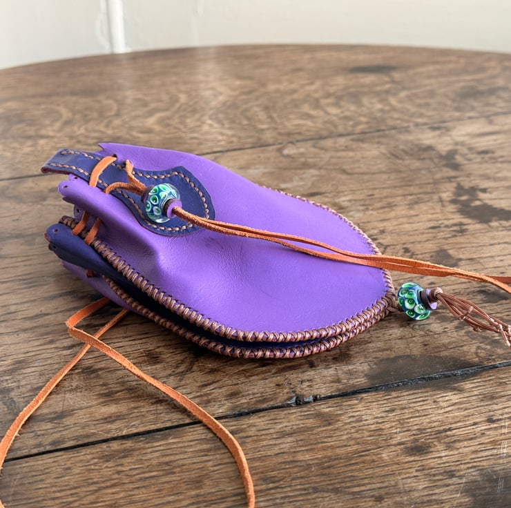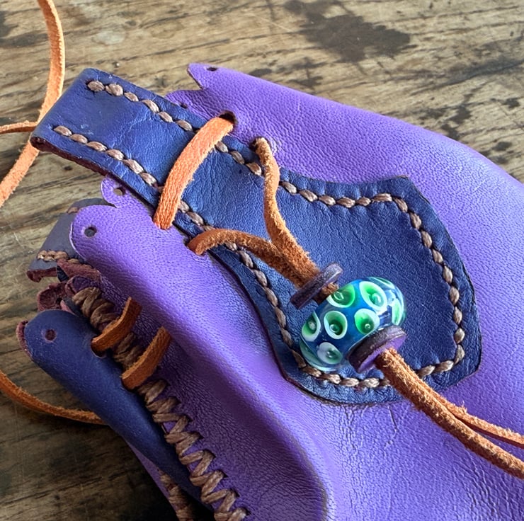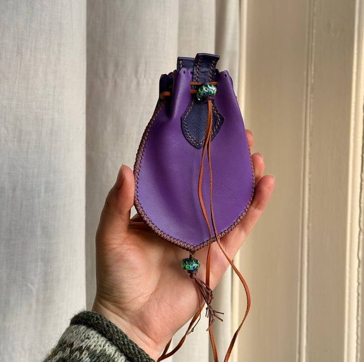 This leather pouch/purse was designed and handmade by Gail. It is based on similar purses that were popular in medieval Britain.