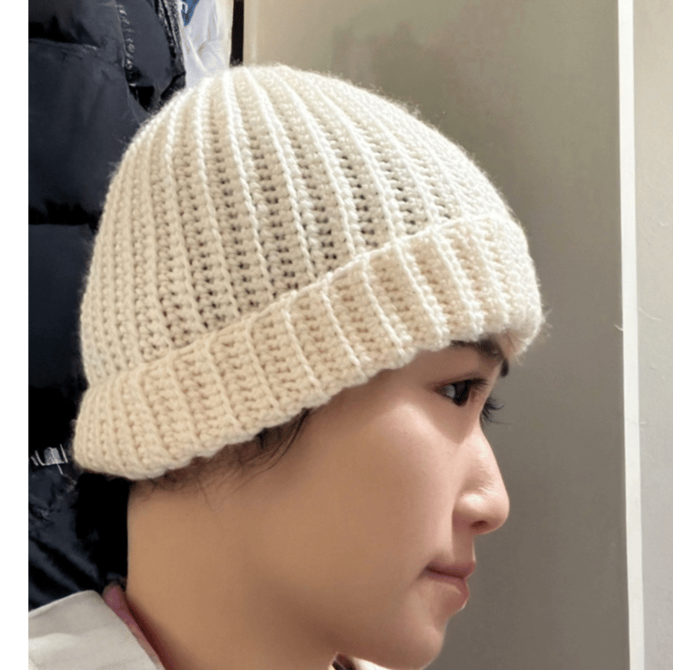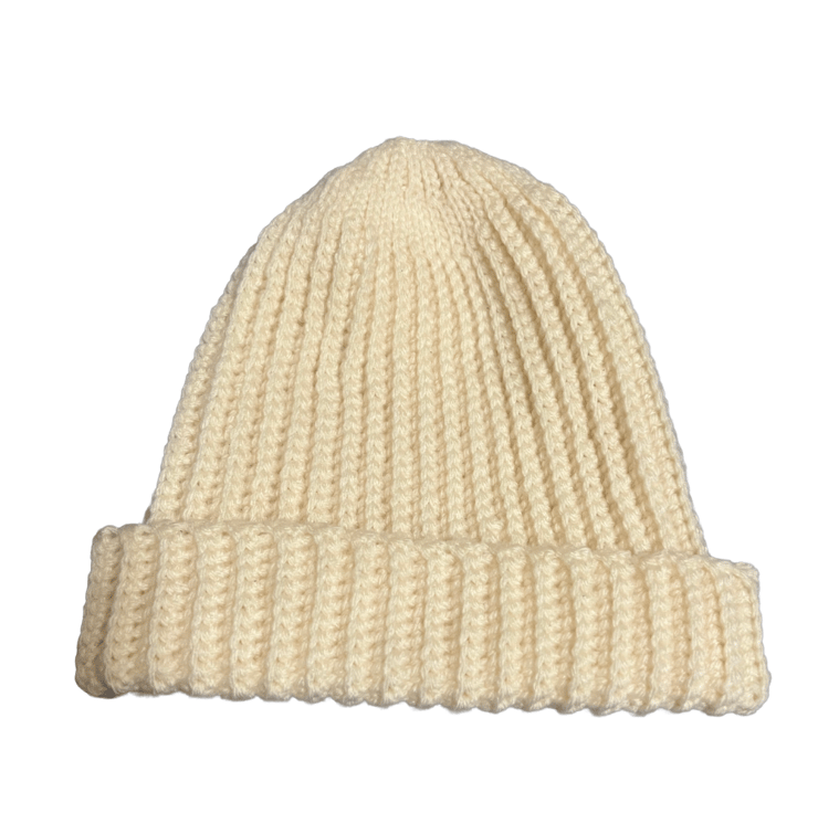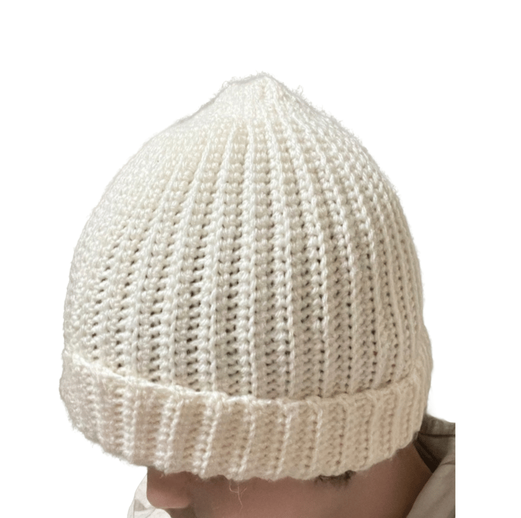 A cosy, handmade beanie hat knitted from soft white yarn, featuring a chunky texture and subtle cable pattern. The snug fit and warm stitches make it perfect for chilly days, while the simple elegance suits any outfit. Machine washable .