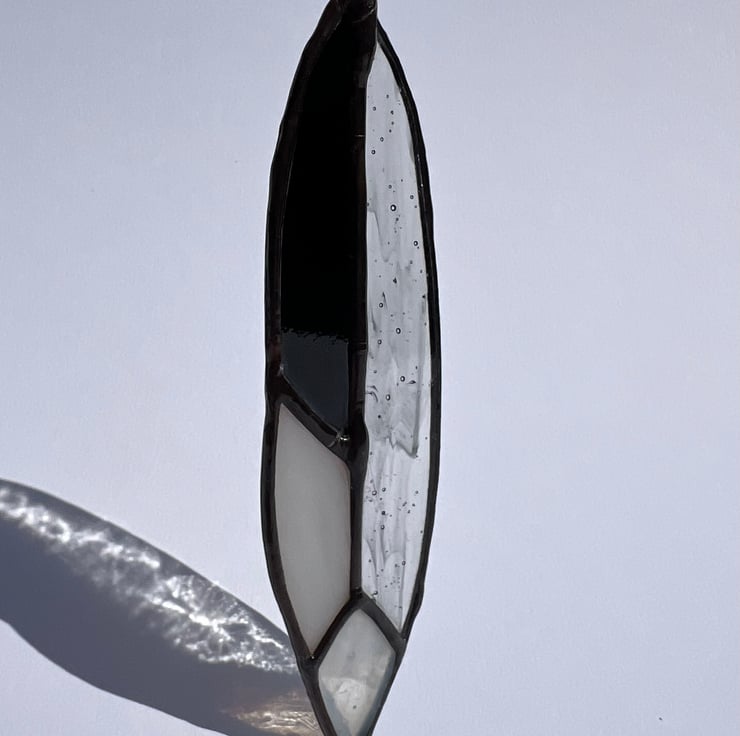 Pretty and elegant in navy, white, and iridescent silver, this stained glass feather is a free cut design so there will only ever be one like this!