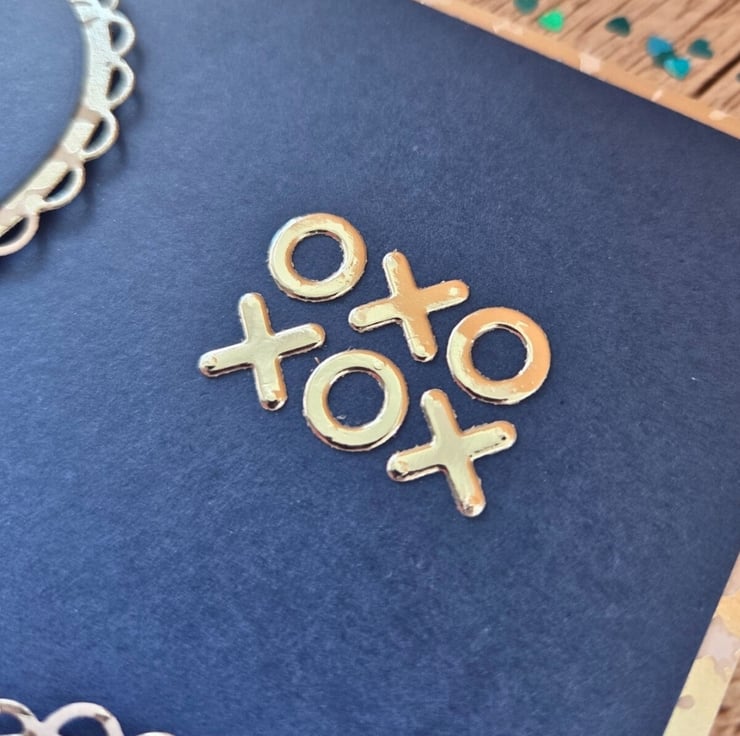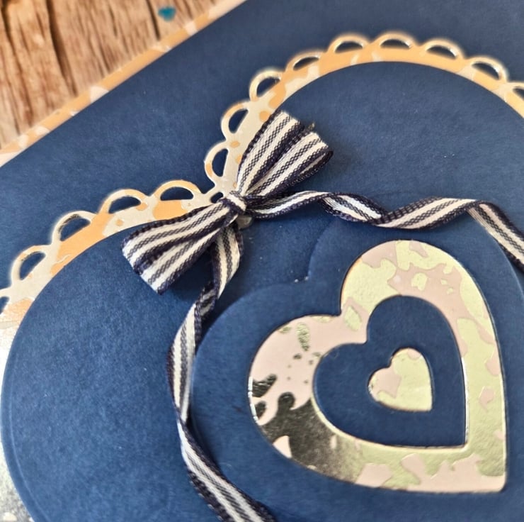 Made of a white card base layered with silver mirror paper & blue cardstock, with two large hearts placed diagonally. The hearts are also layered with silver & blue card and they have a smaller heart in the middle, paper pieced with the same colours and embellished with a ribbon bow in blue & white. On the bottom left, there are two wooden hearts embellished with silver colour drops, while on the top right the letters xox & oxo are cut out of silver mirror card. Finished with dimensional colour drops in silver, on the four corners. Inside, the white insert panel is also layered with the same mirror paper as the outside, and reads the sentiment "For My Valentine With Love" in silver foiling letters.