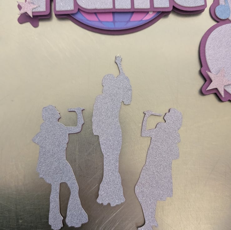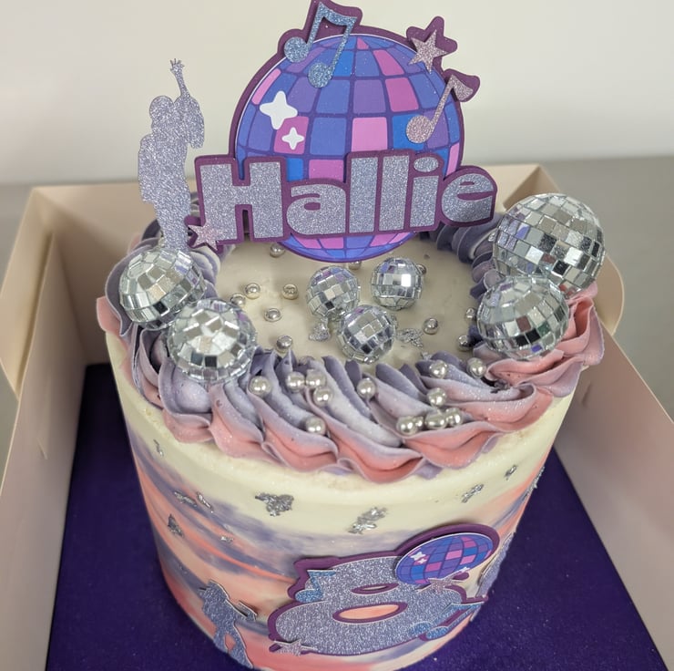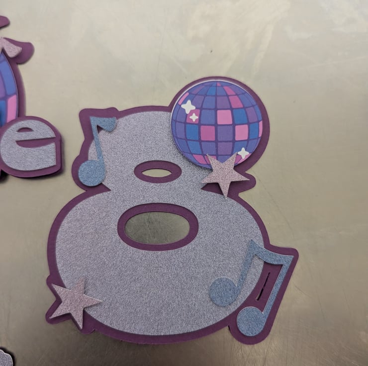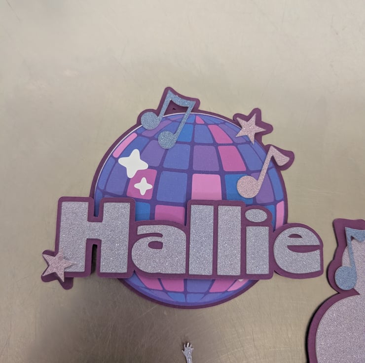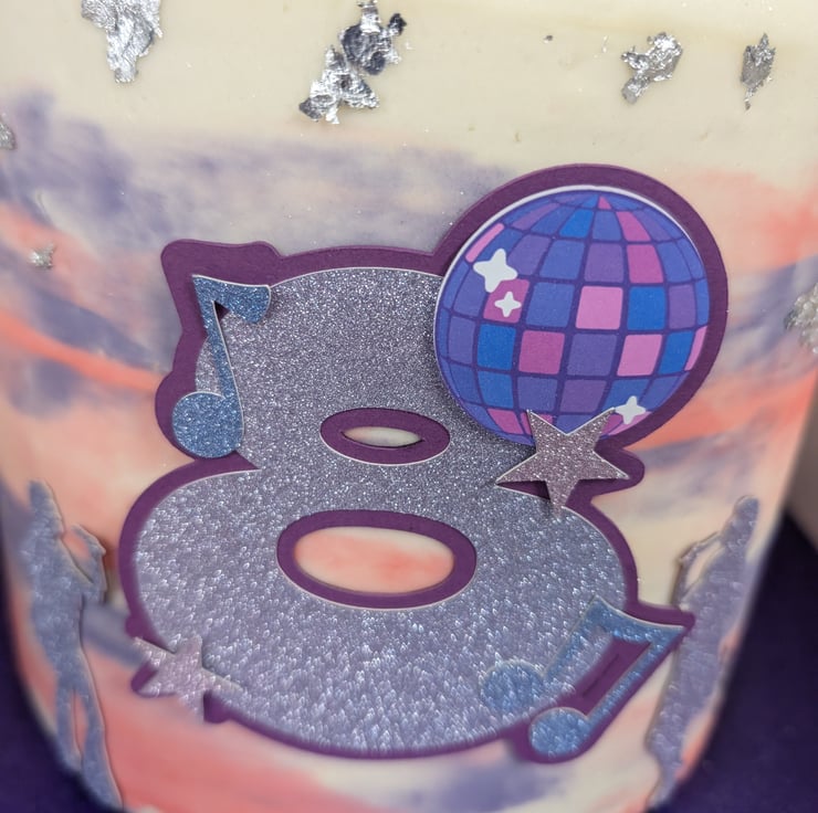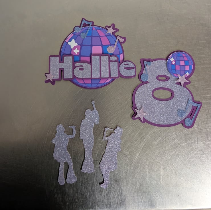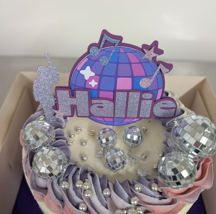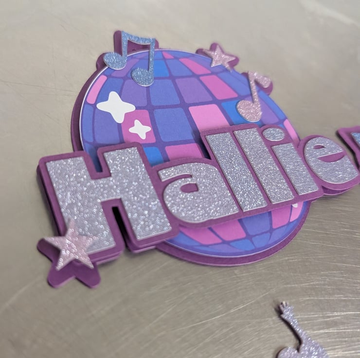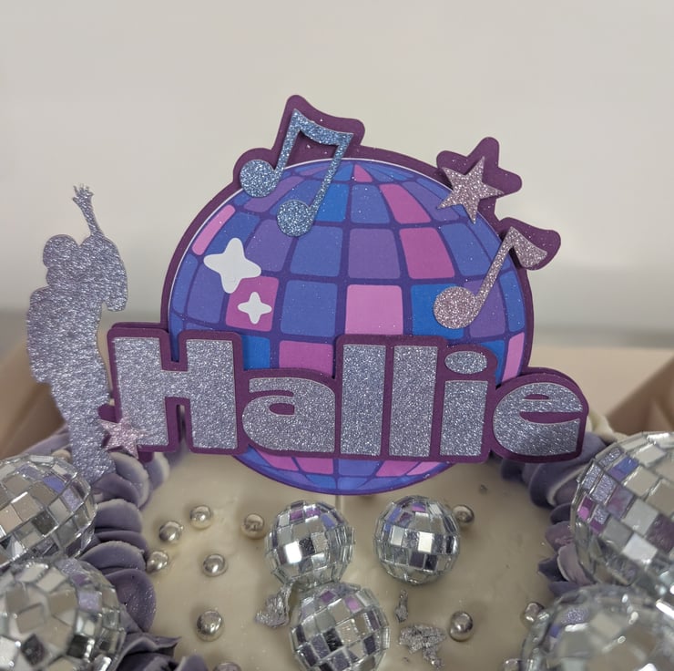 This set of Cake toppers comes in three parts. There is the recipients name with some die cut disco balls and music and stars and their age with a disco ball, stars and music and some 70's style singers. The toppers can be merged to be 1 piece or the name and age can be swapped.